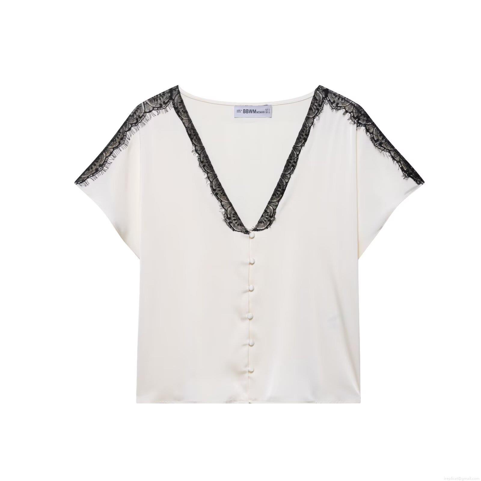 • Women's Sexy Satin Two Piece Shorts Set V-Neck Lace Patchwork Short Sleeve Button Top and High Waist Shorts Streetwear Casual Loungewear