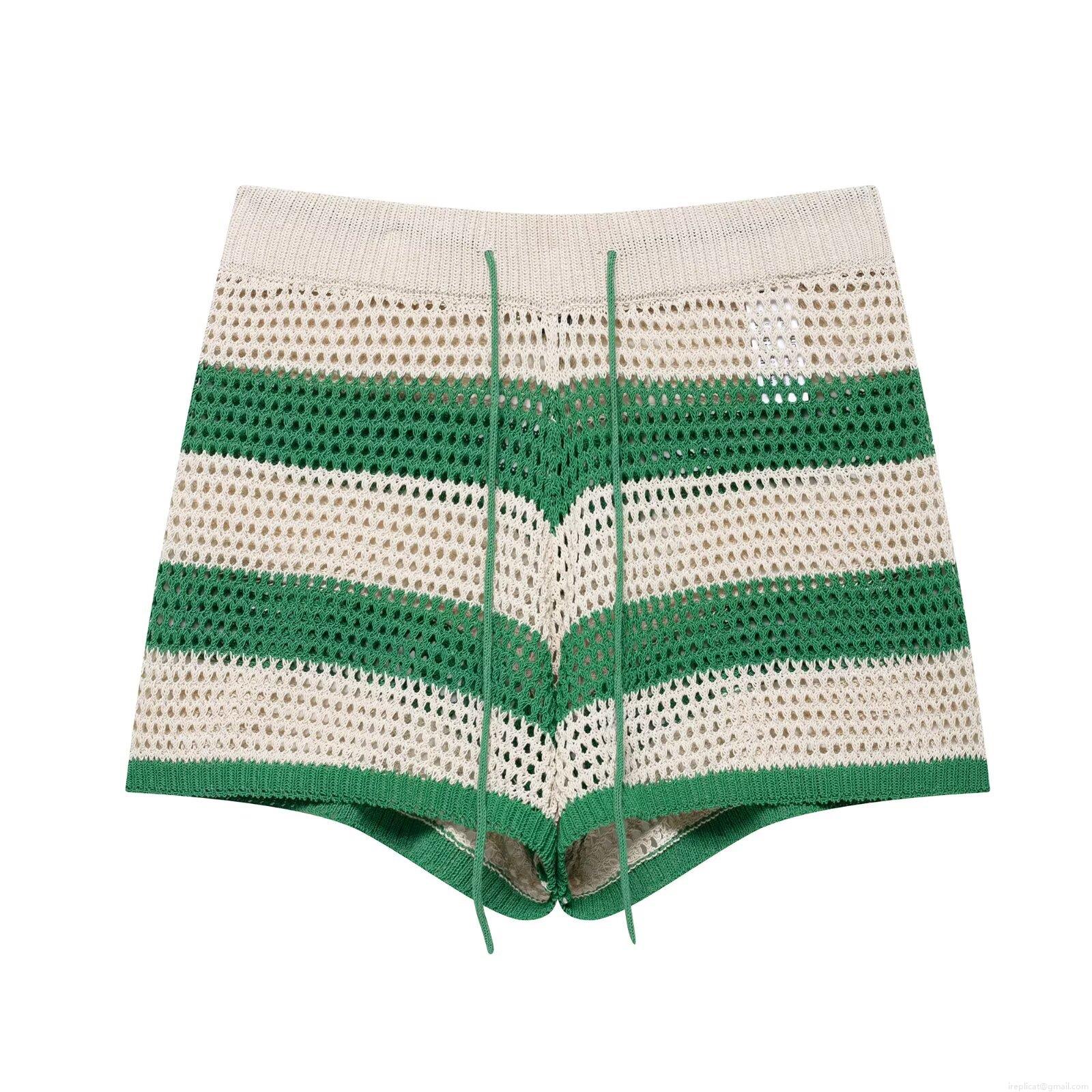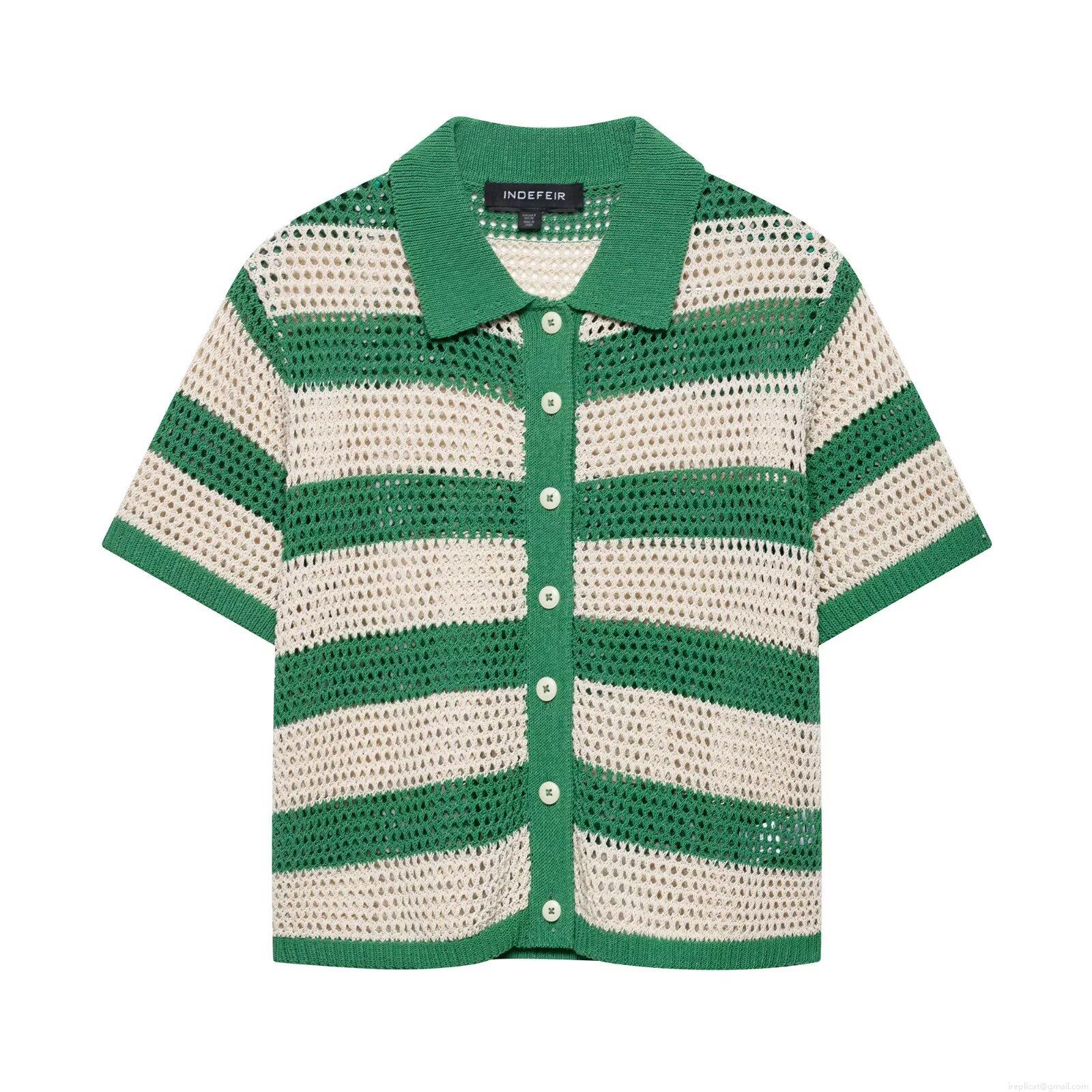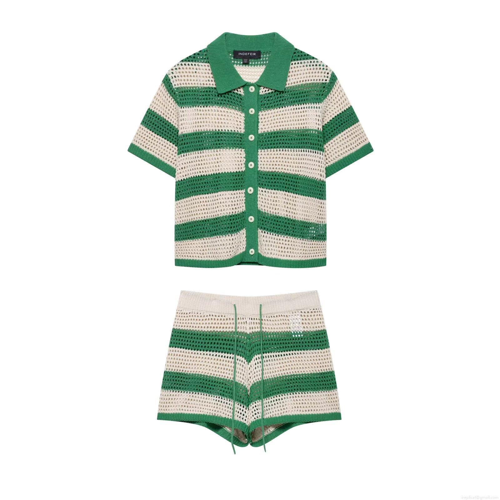 Women's Striped Knit Polo Top And Shorts Set Polyester Crochet Hollow Out Short Sleeve Two Piece Outfits Casual Summer Streetwear Set For Women