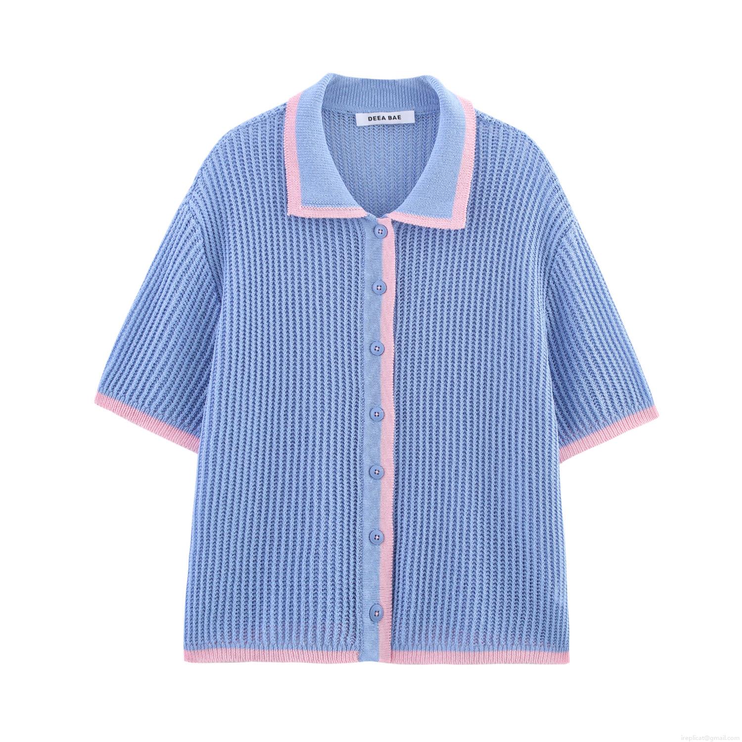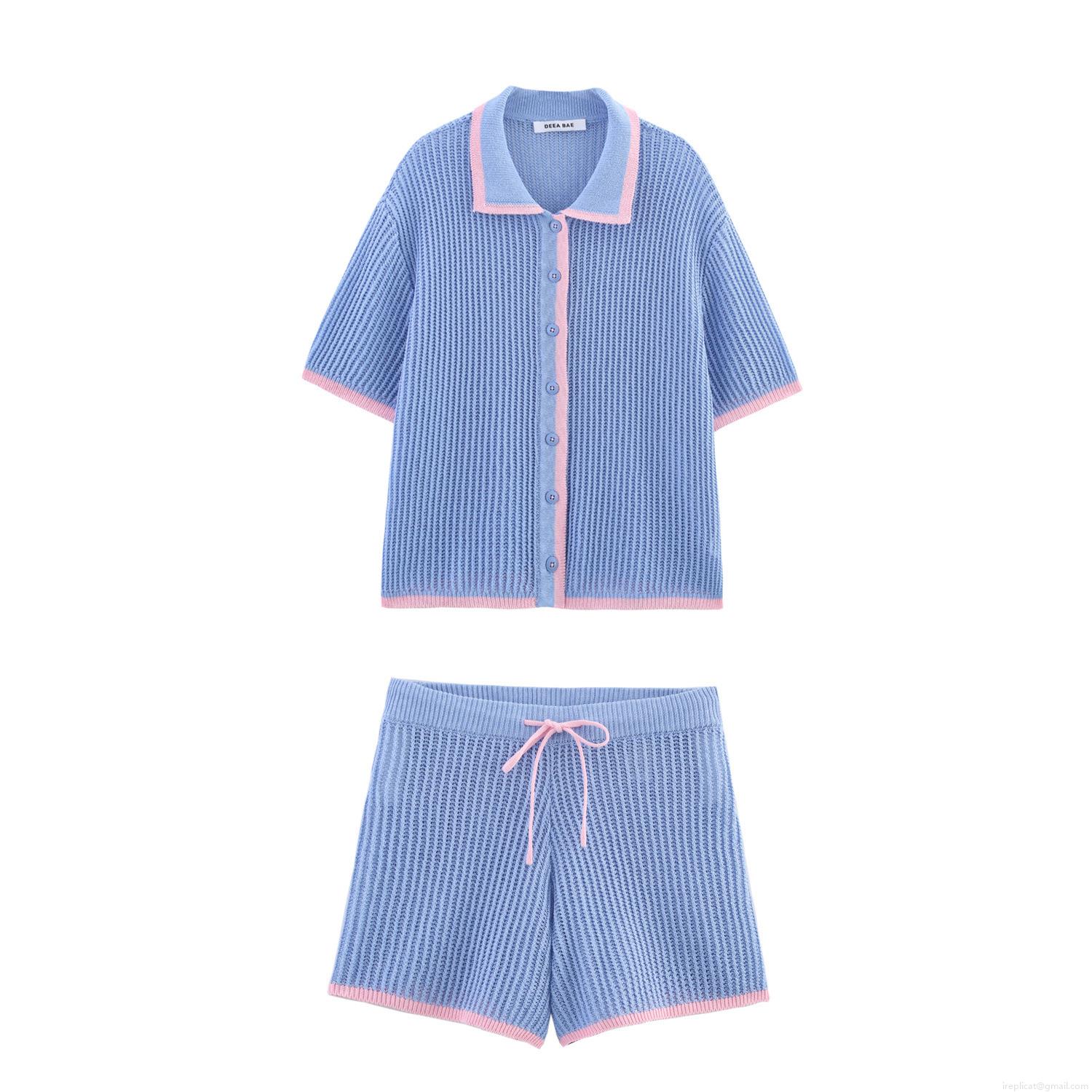 • Women's Summer 2-Piece Knit Set Color Block Short Sleeve Polo Shirt And Drawstring Shorts Hollow Out Streetwear Outfit Light Blue Pink Polyester