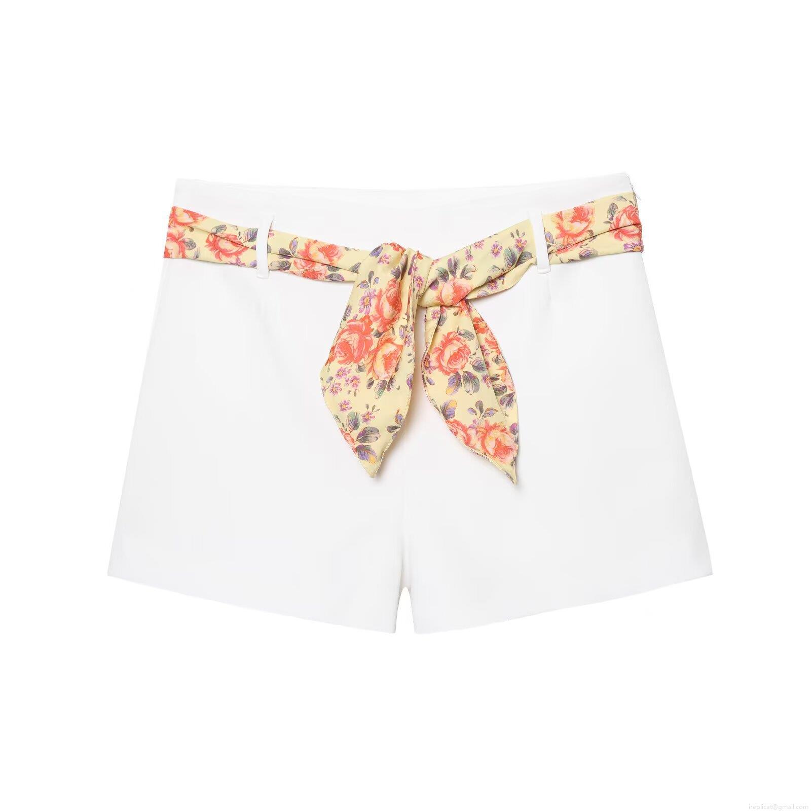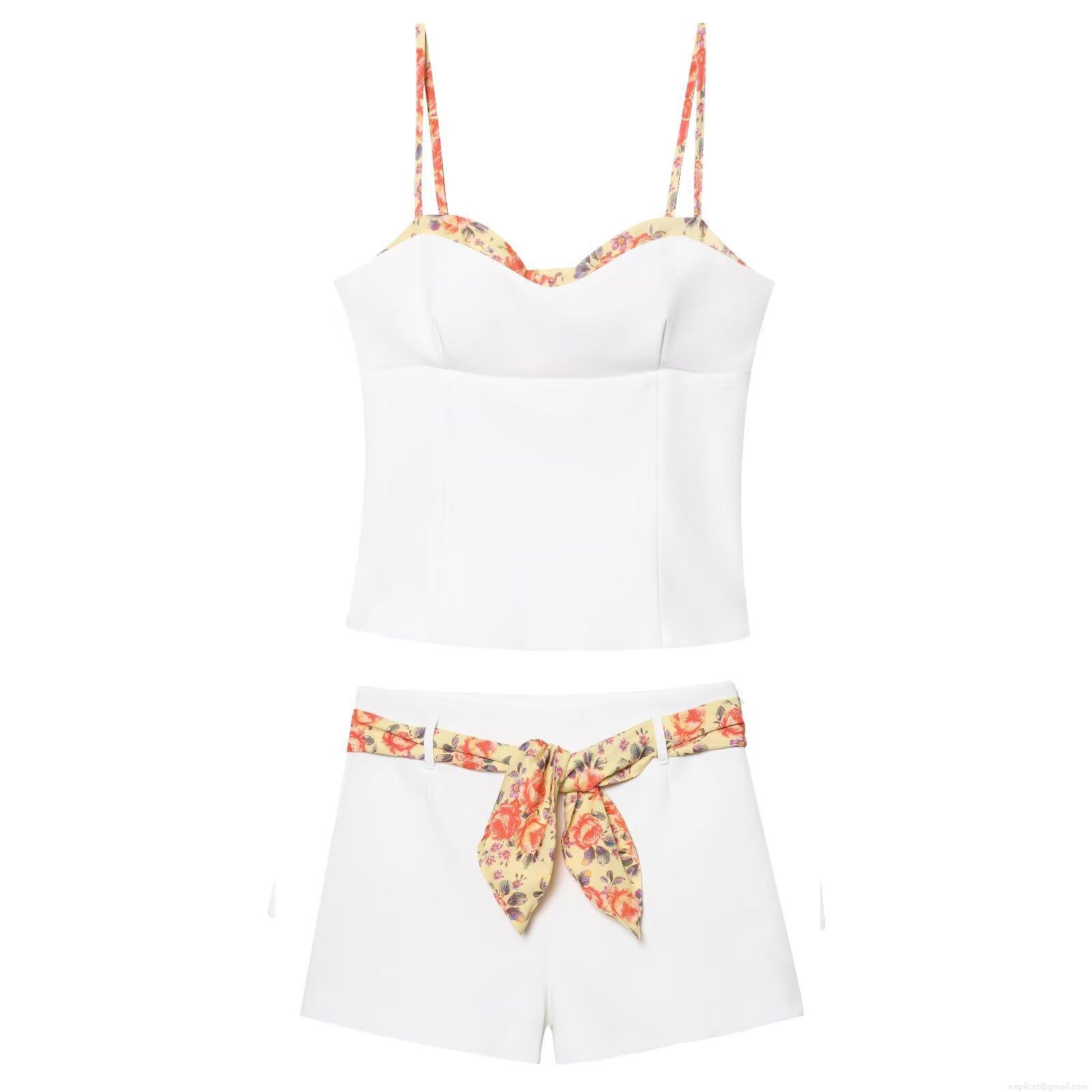 • Women's Summer European Style White Floral Print Camisole and Shorts Set Sleeveless Two Piece Casual Streetwear Outfit with Tie Belt