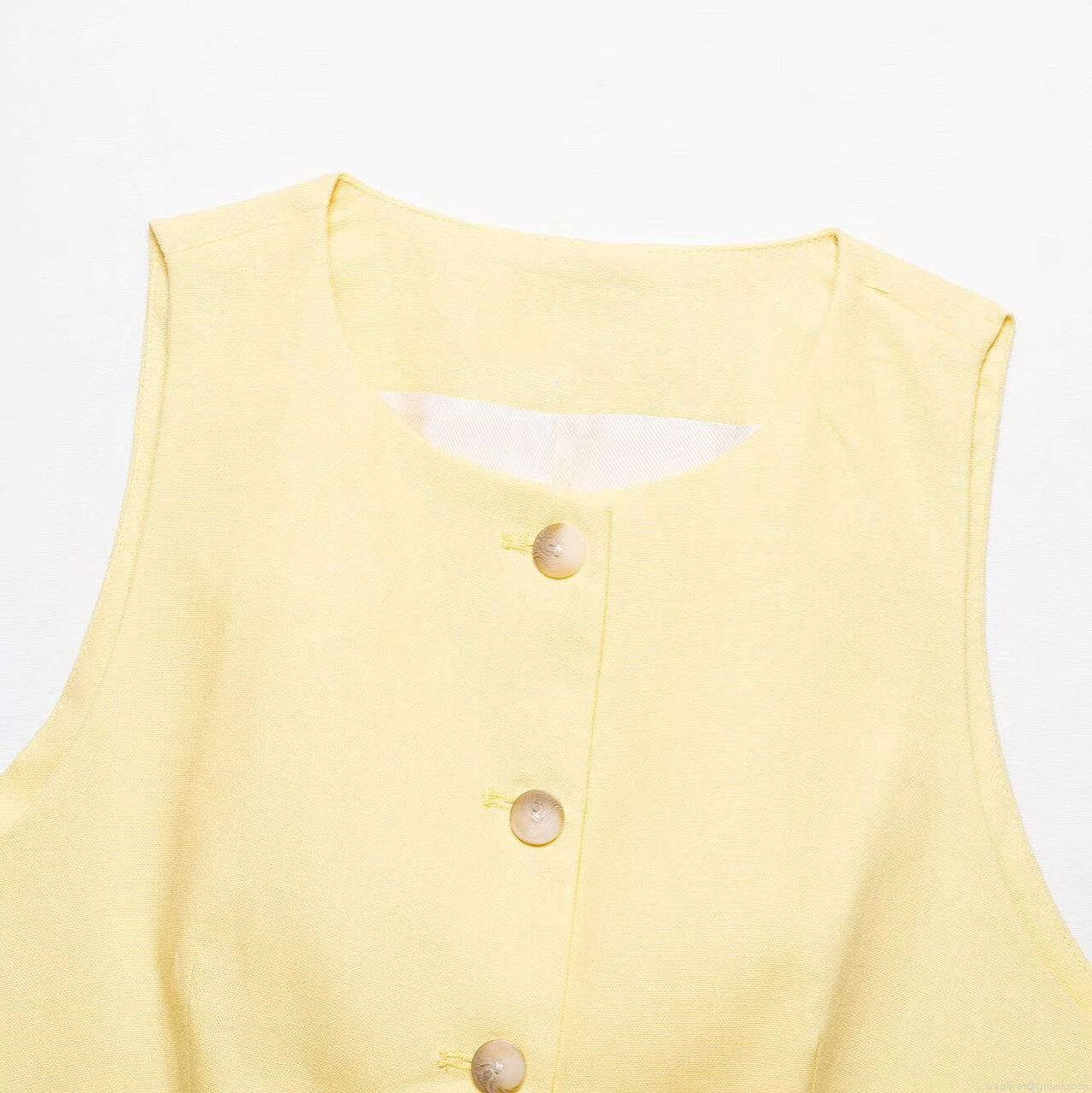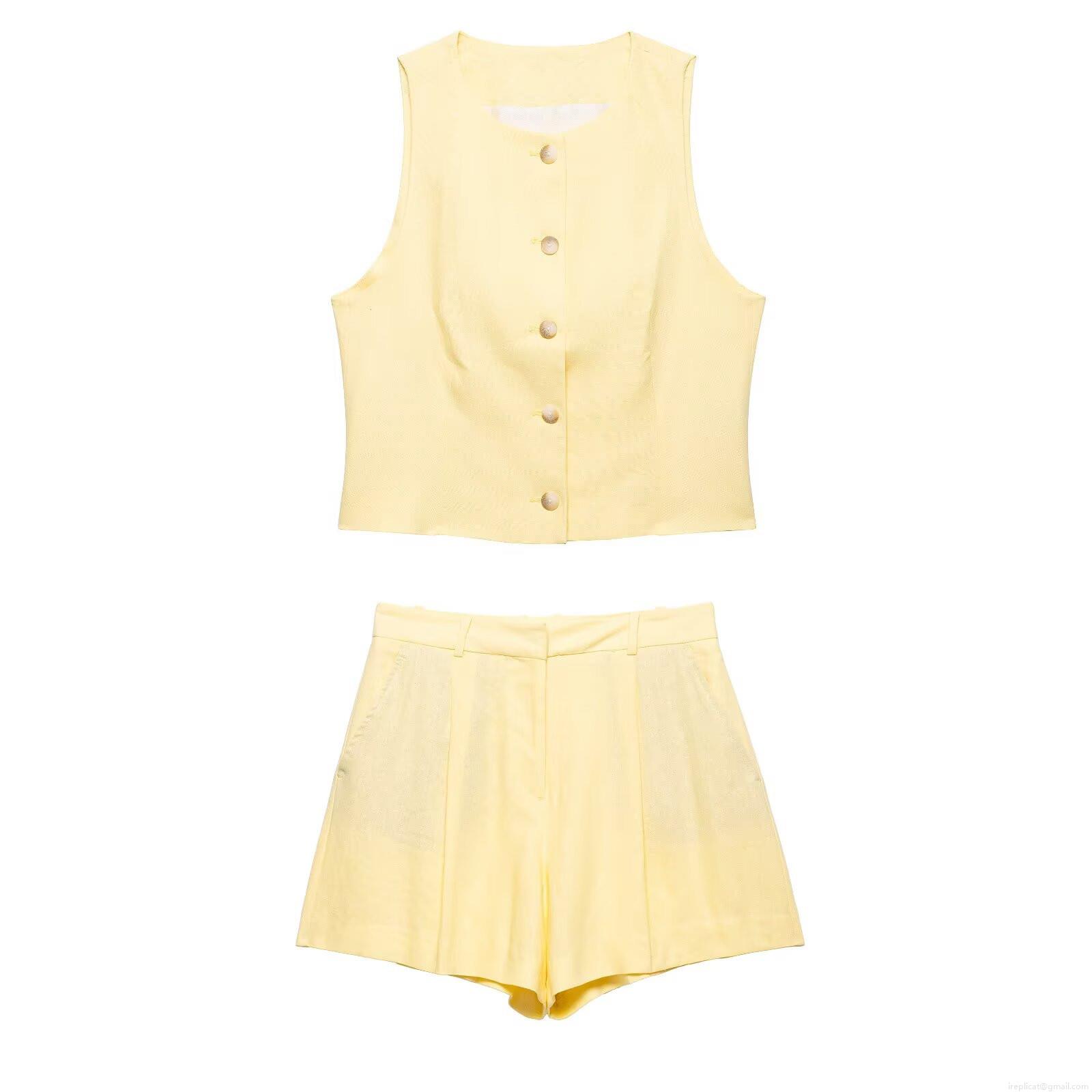 • Women's Summer Fashion Slim Sleeveless Vest And High Waist Wide Leg Shorts Two Piece Set 100% Polyester Solid Color Button Up Co-ord Outfits