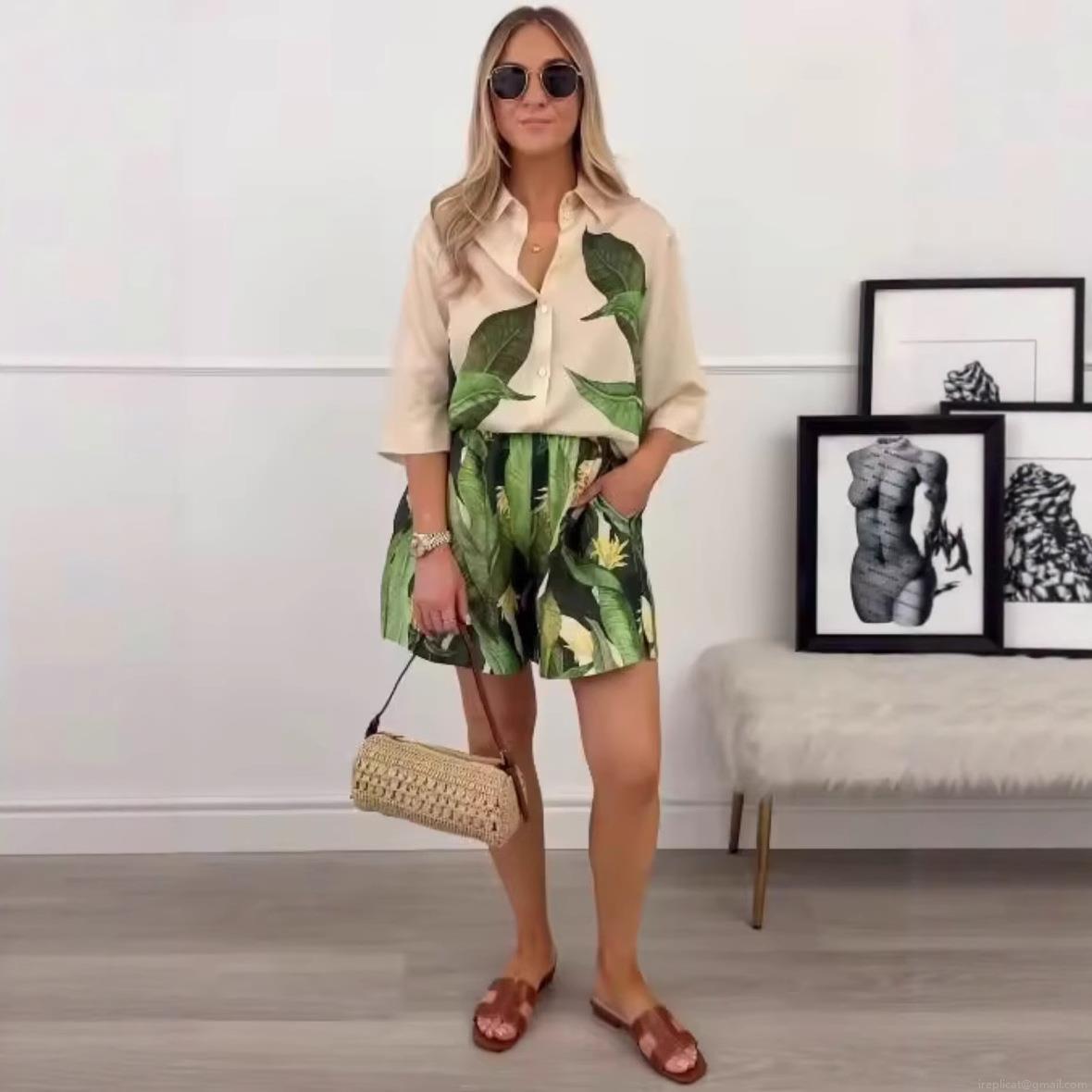 • Women's Tropical Leaf Print Satin Two Piece Set Short Sleeve Button Up Shirt And Elastic Waist Shorts Summer Vacation Beach Outfits Casual Loungewear