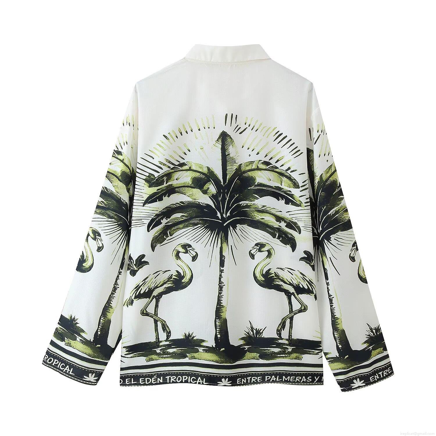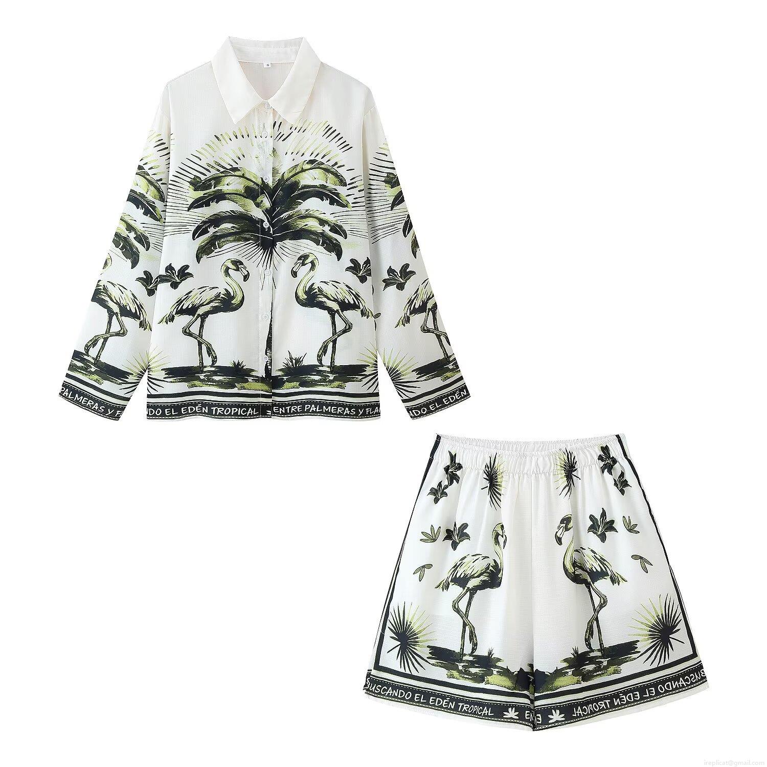 • Women's Tropical Print Two Piece Set Polyester Long Sleeve Button Down Shirt And Elastic Waist Shorts Flamingo Palm Leaf Vacation Holiday Summer Casual Beachwear For Women
