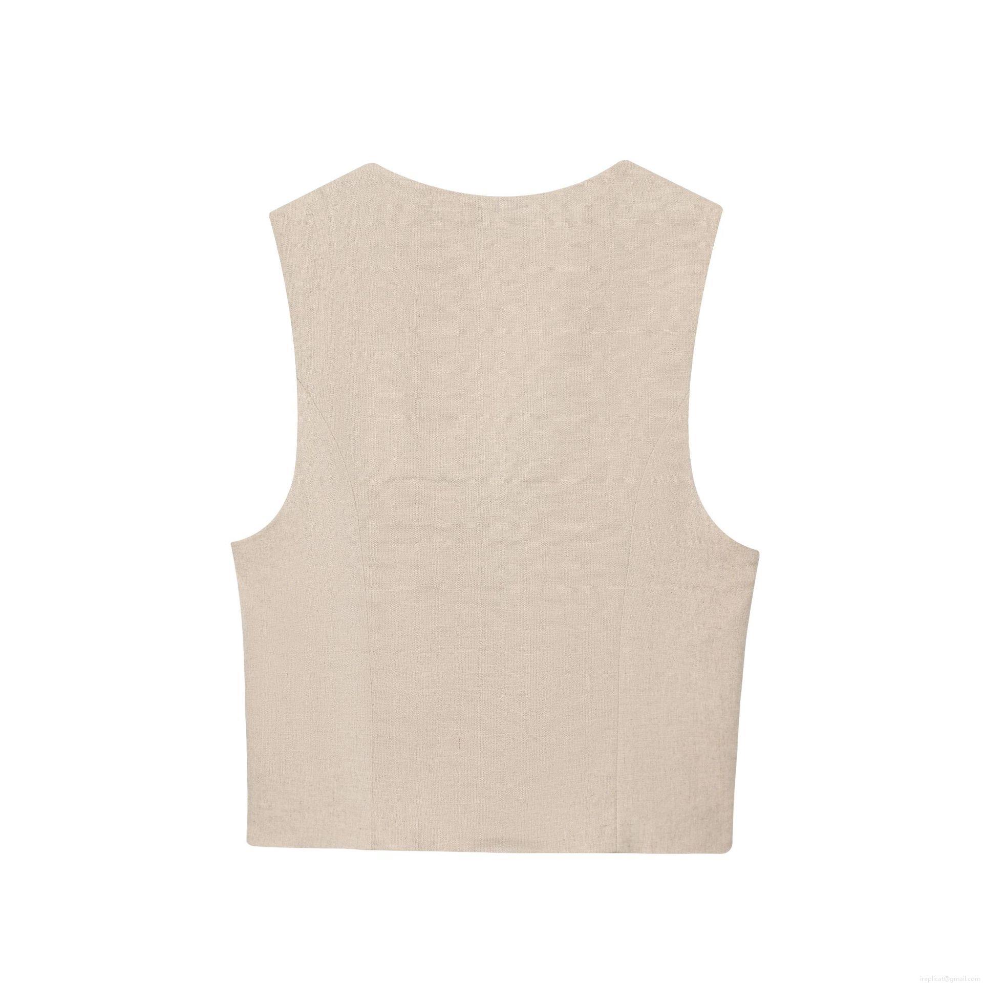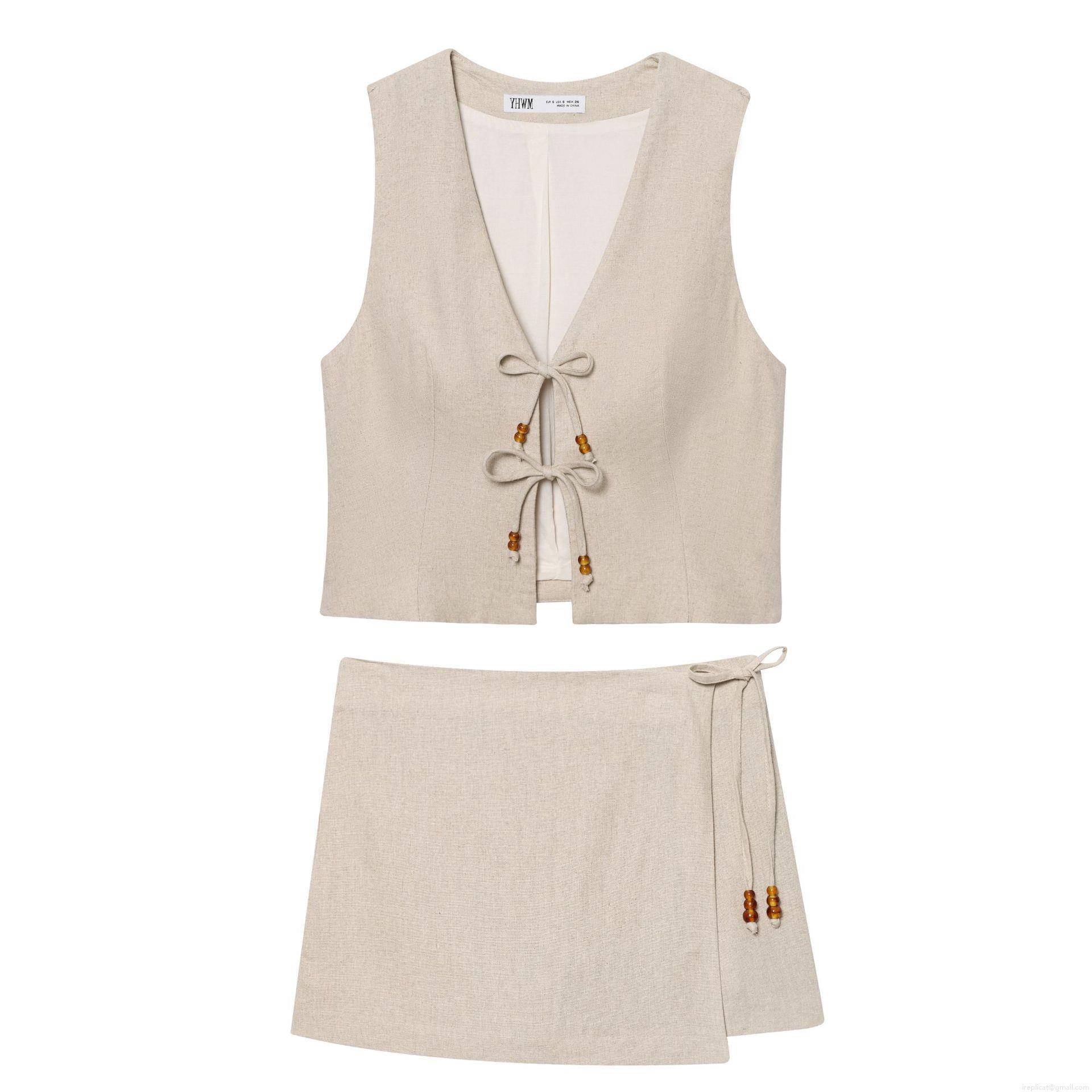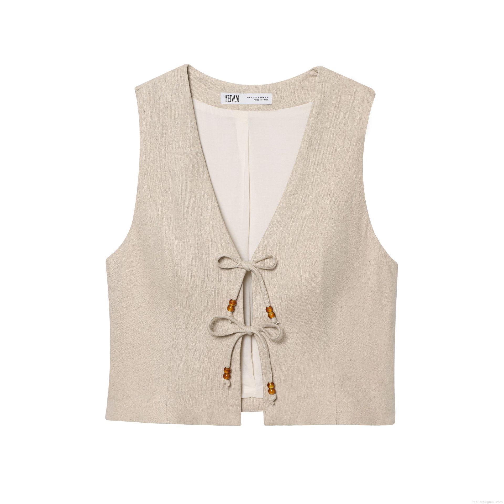 • Women's Two Piece Cotton Linen Vest And Shorts Set V-Neck Beaded Tie Front Top High Waist Wrap Shorts Casual Vacation Oatmeal Outfits