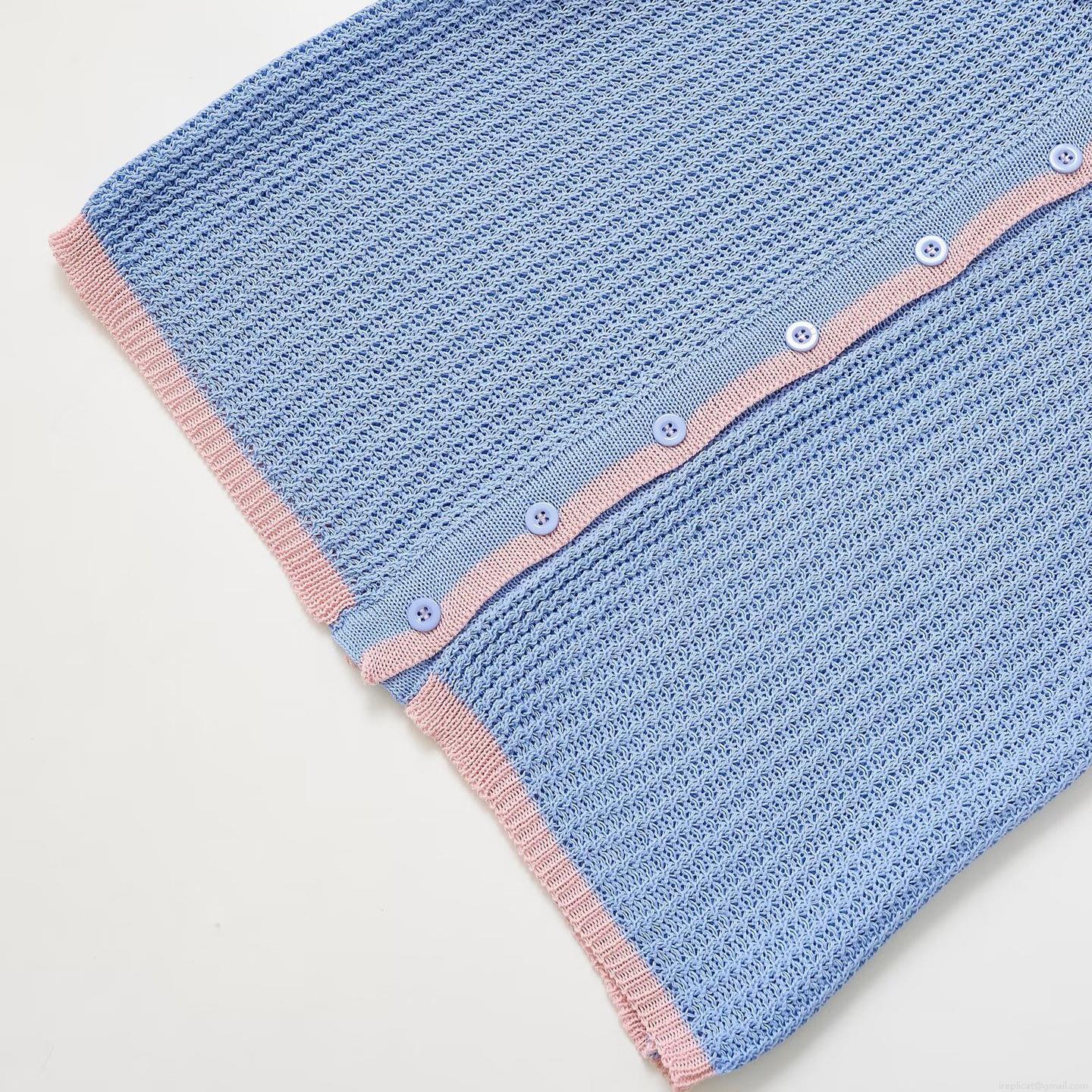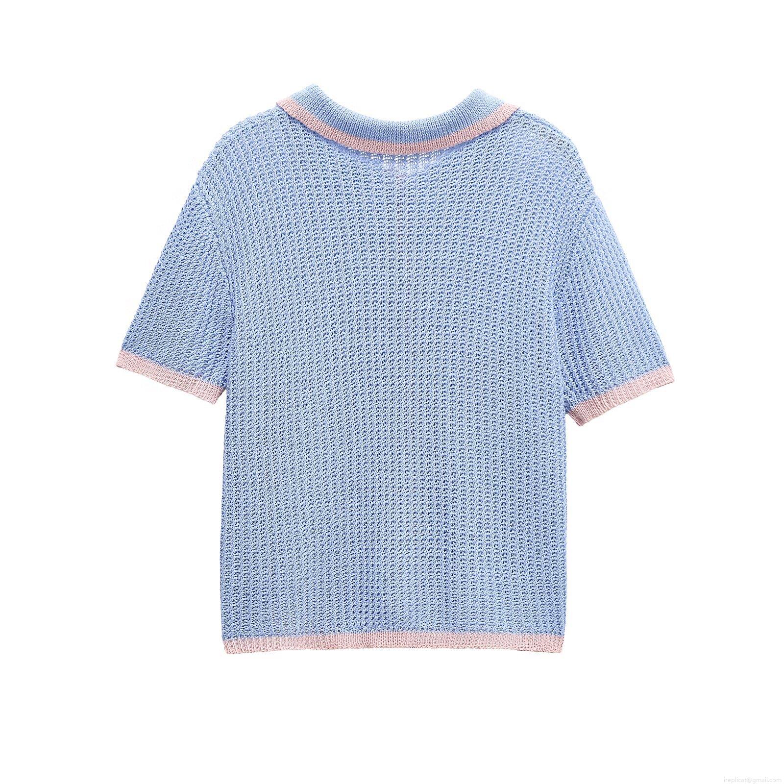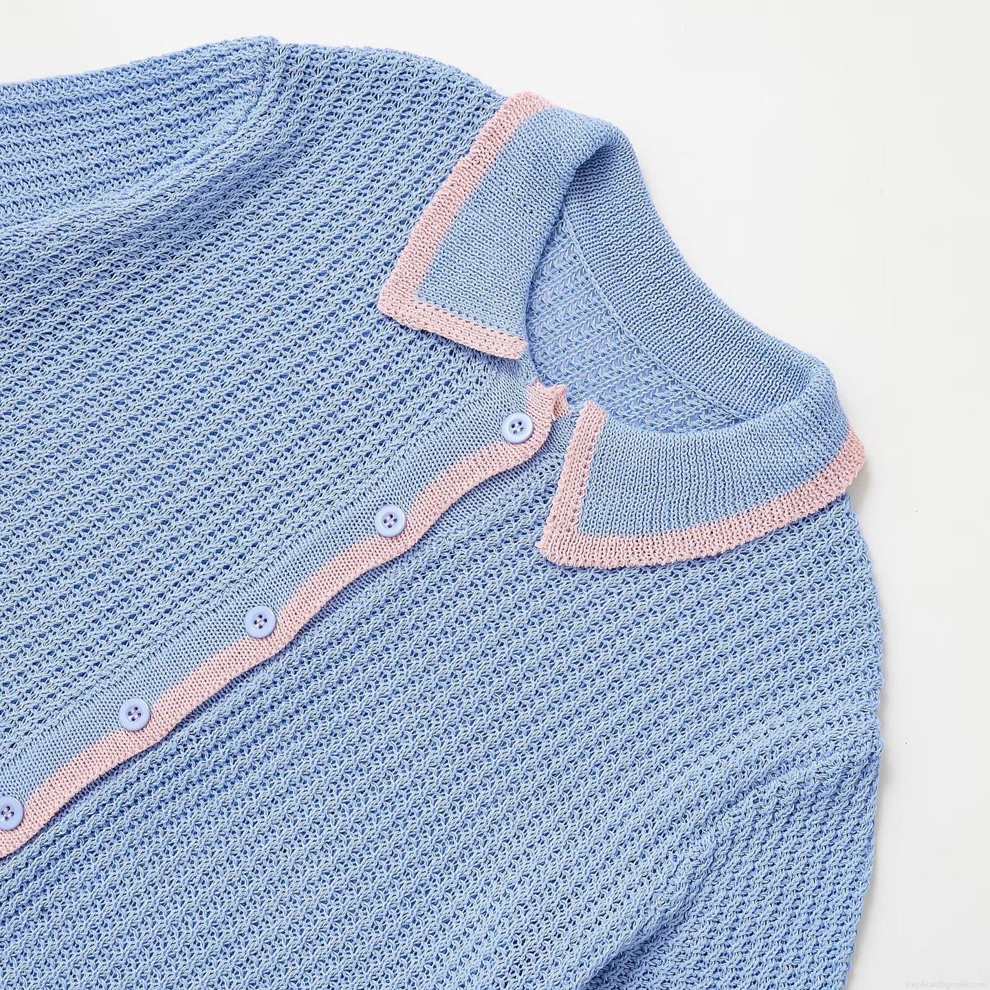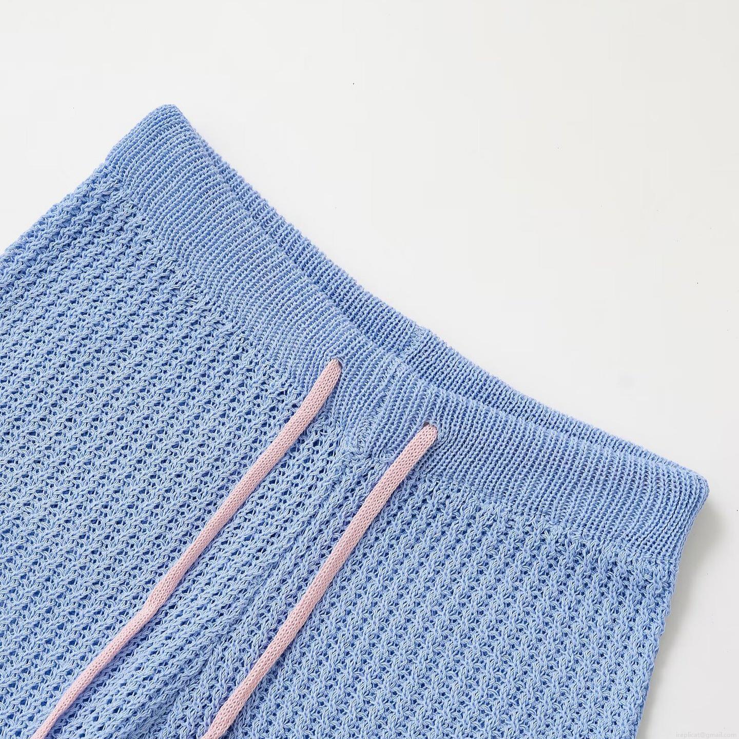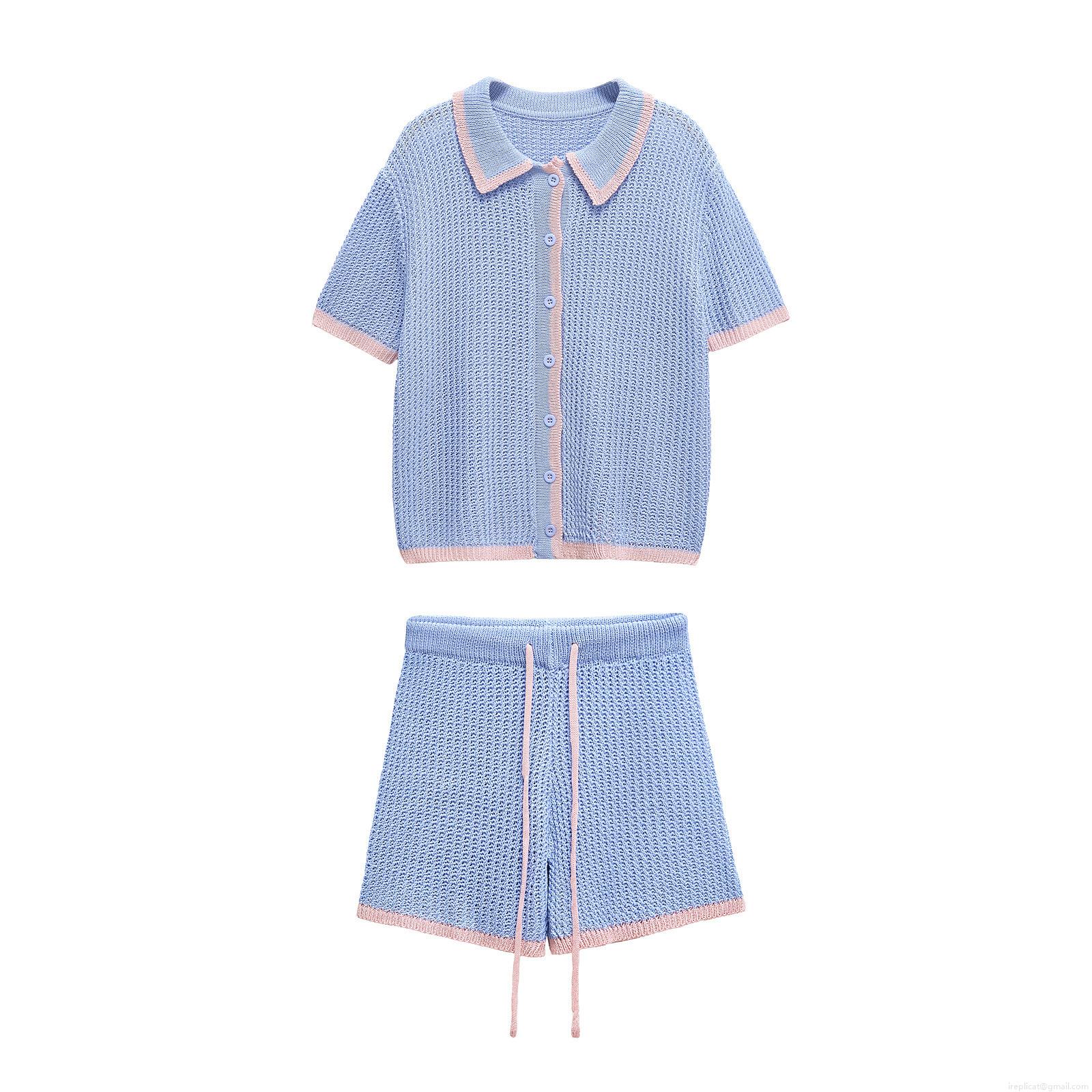 • Women's Two Piece Knit Clothing Set Casual Hollow Out Contrast Trim Polo Shirt and Drawstring Shorts Summer Breathable Cotton Knit Outfits for Women