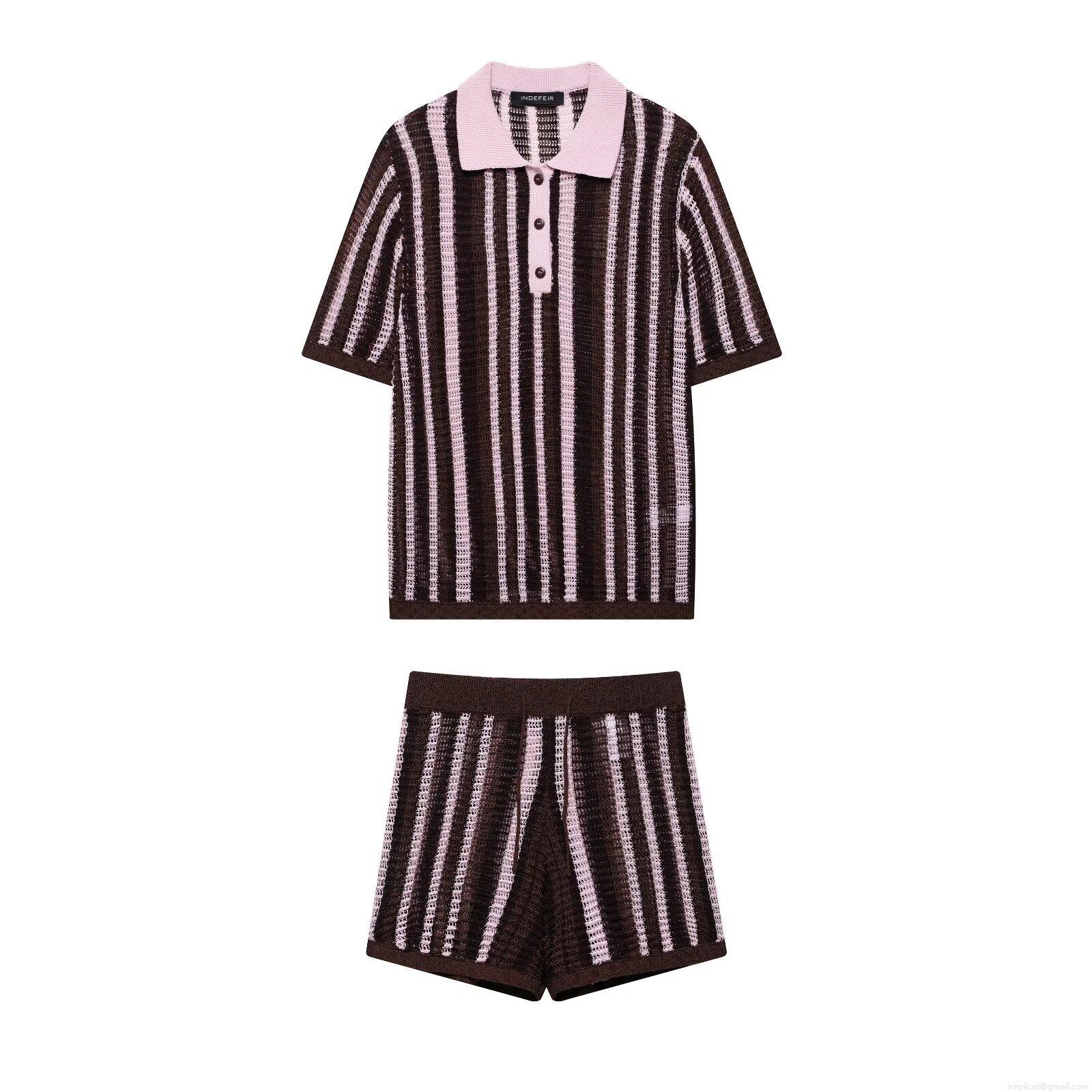 • Women's Two Piece Knit Shorts Set Striped Polo Neck Short Sleeve Top And Drawstring Shorts Casual Polyester Knit Summer Beach Outfits