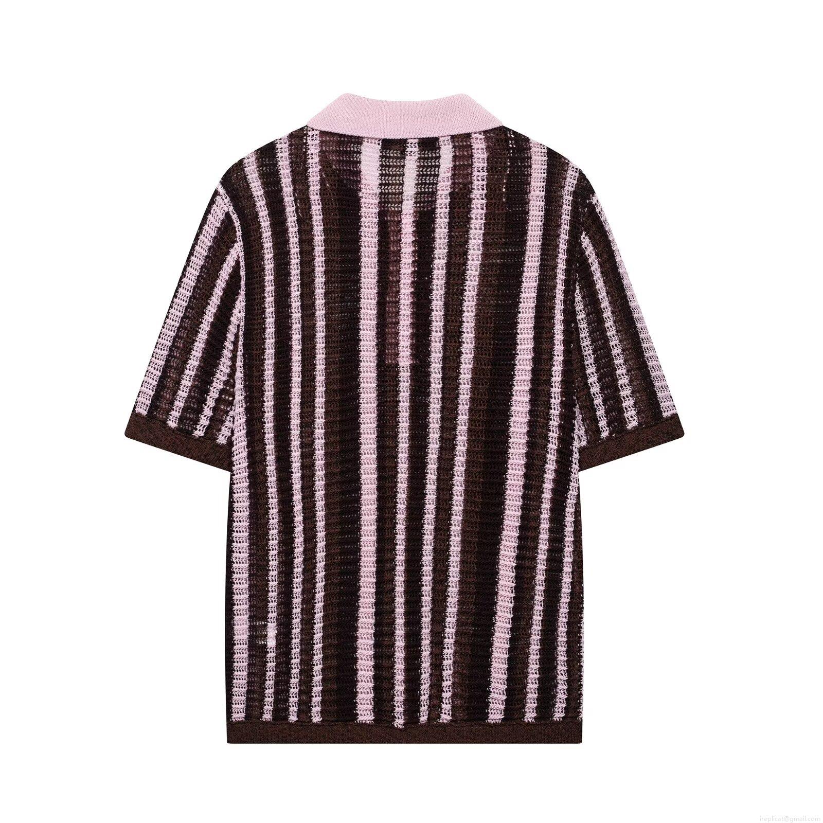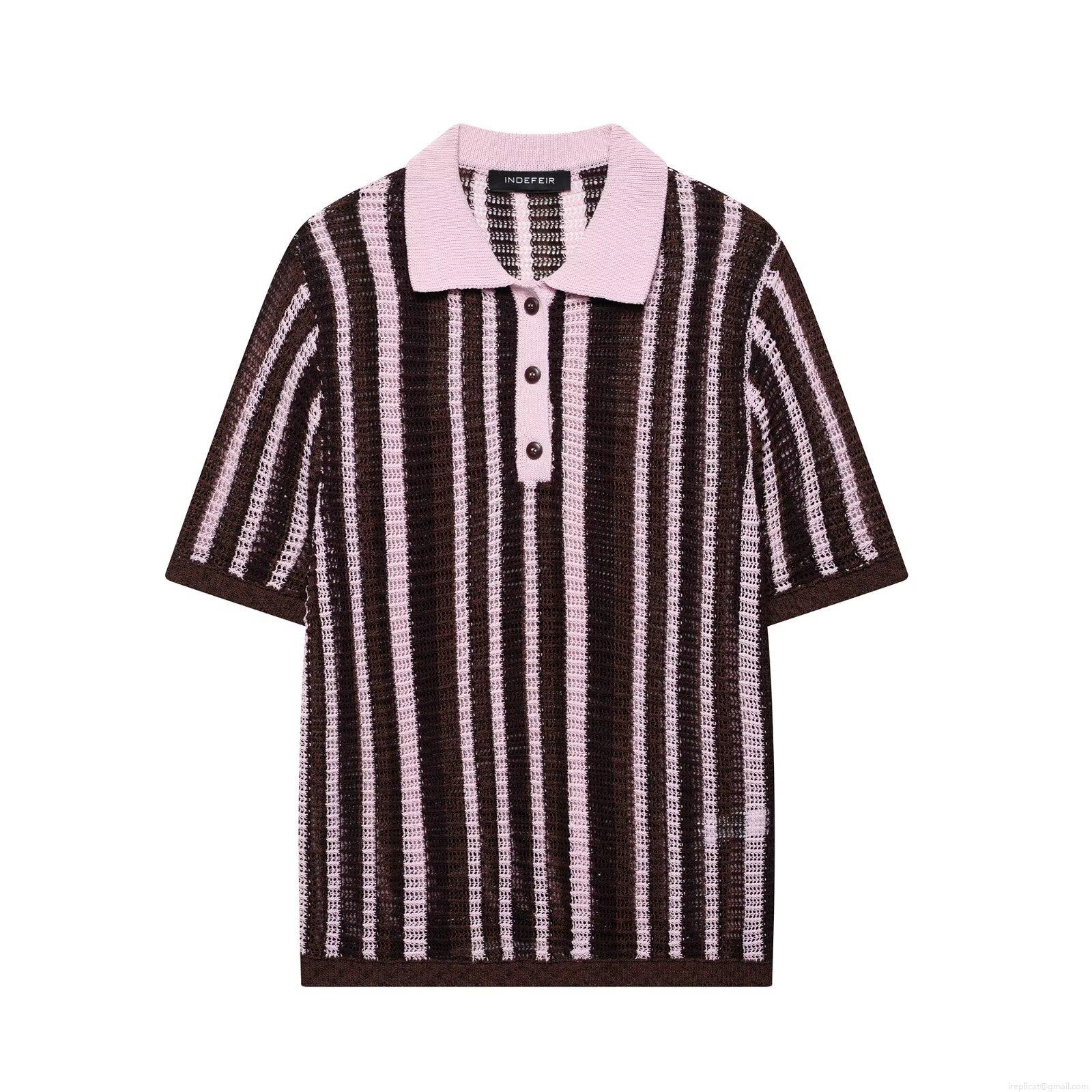 Hollow Out, Color Blocking, Vertical Stripes, Lace, Polo Collar, Button Decoration