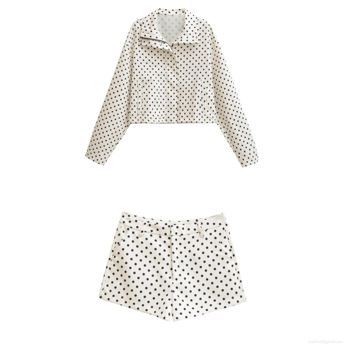 • Women's Two Piece Set Autumn Stand Collar Long Sleeve Polka Dot Jacket And High Waist Shorts Streetwear Outfit Polyester White Black Dots Casual Suit