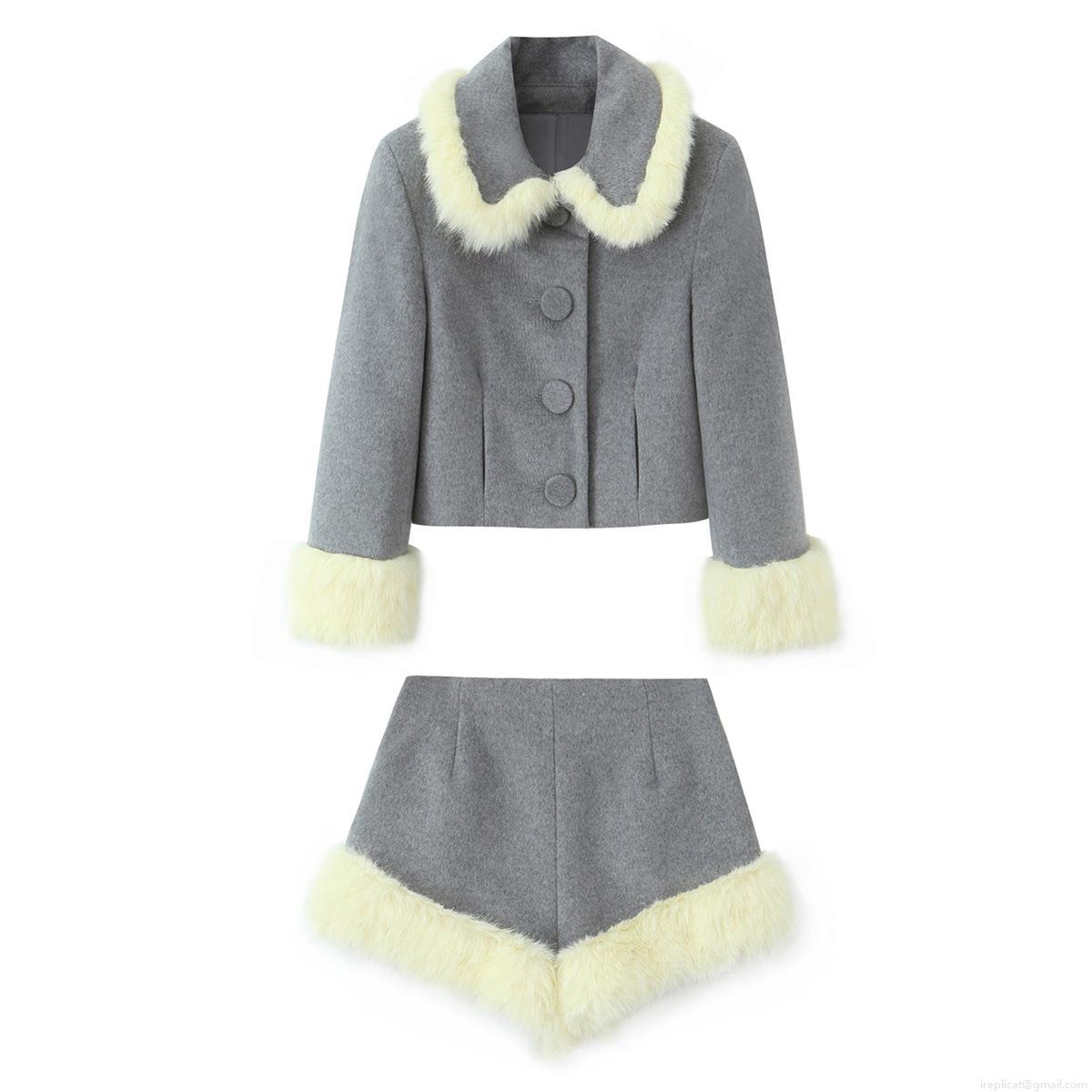 • Women's Two Piece Set Faux Fur Trim Crop Jacket And Shorts Set Grey Polyester Winter Streetwear Elegant Outfit For Women