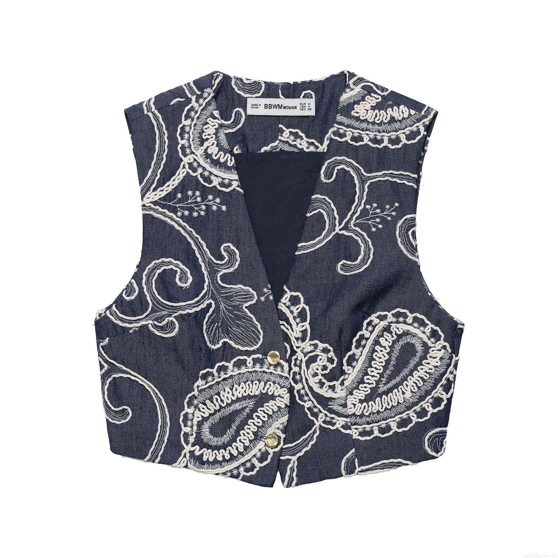 • Women's Two Piece Set Navy Blue Denim Texture Paisley Embroidered Vest Top and High Waist Culottes Shorts Boho Summer Outfits Streetwear
