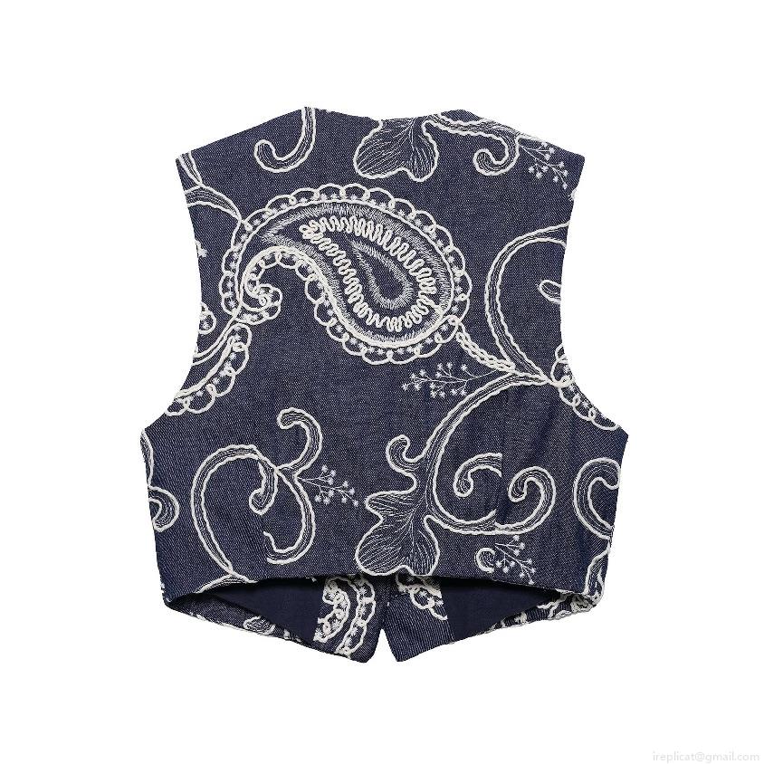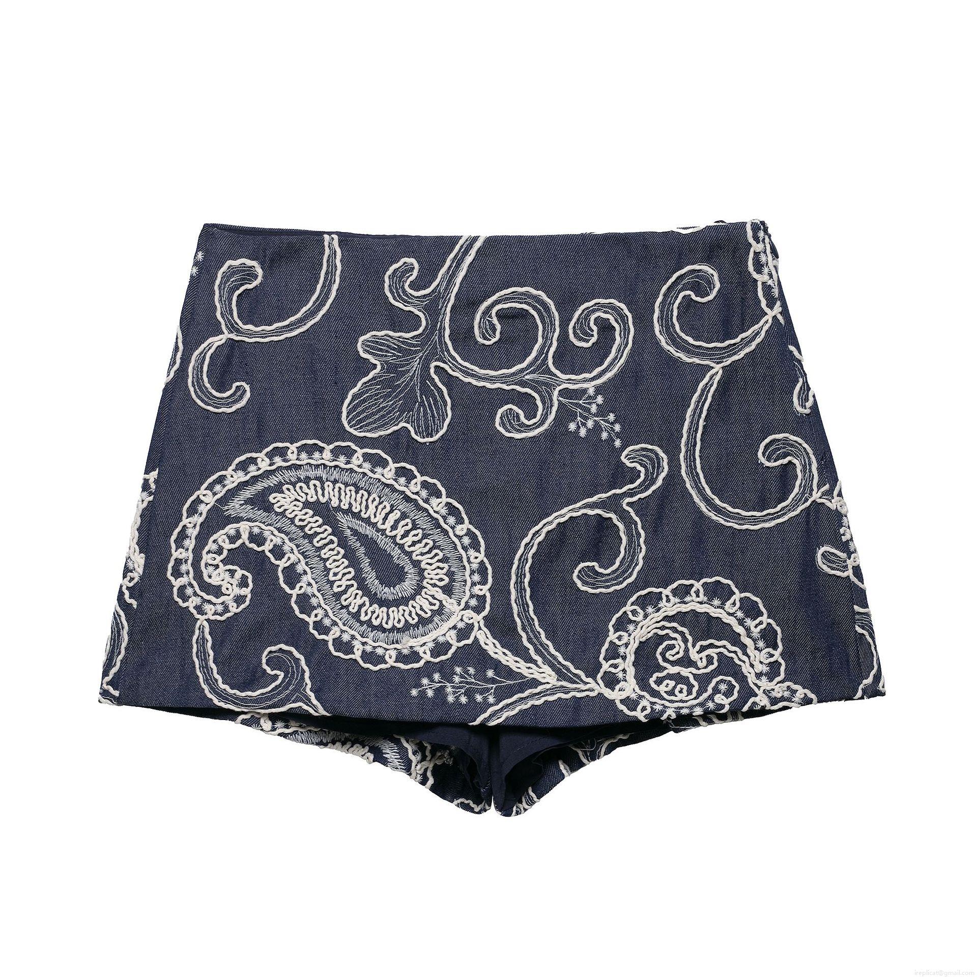 Women's Two Piece Set Navy Blue Denim Texture Paisley Embroidered Vest Top and High Waist Culottes Shorts Boho Summer Outfits Streetwear
