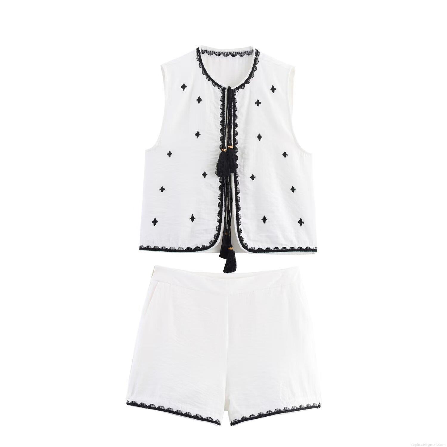 • Women's Two Piece Shorts Set Ethnic Geometric Embroidery Sleeveless Tassel Vest Top And Casual Shorts Set Bohemian Summer Streetwear Outfit Polyester Embroidered Two-Piece Suit