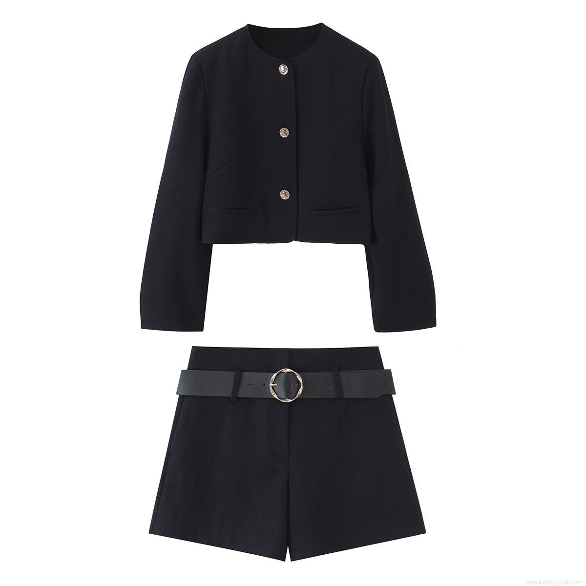 Women's Two Piece Shorts Set Polyester Gold Button Cropped Blazer And High Waist Shorts With Belt Casual Streetwear Autumn Fashion Outfit