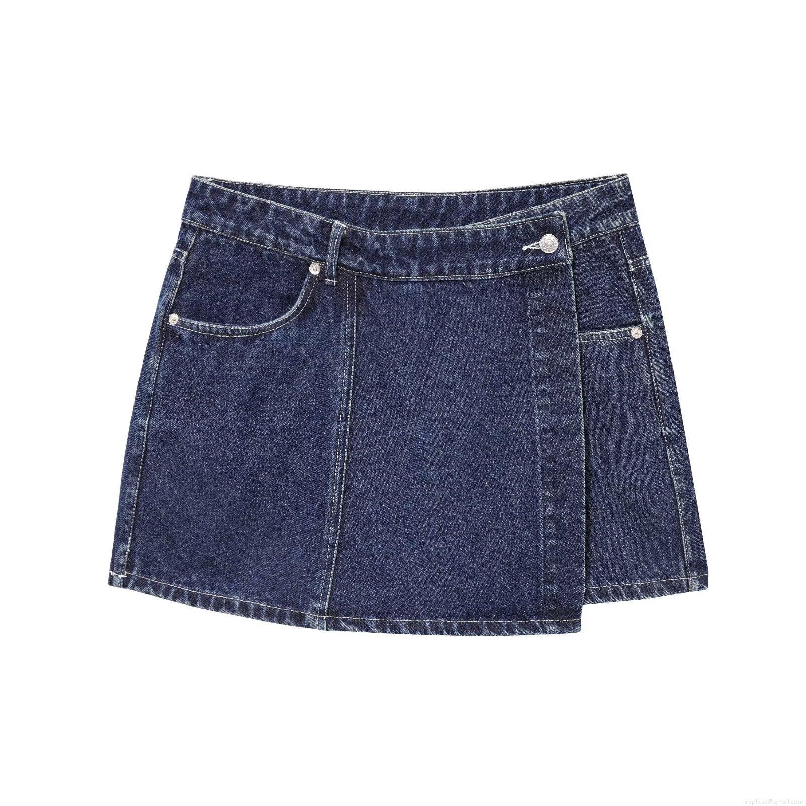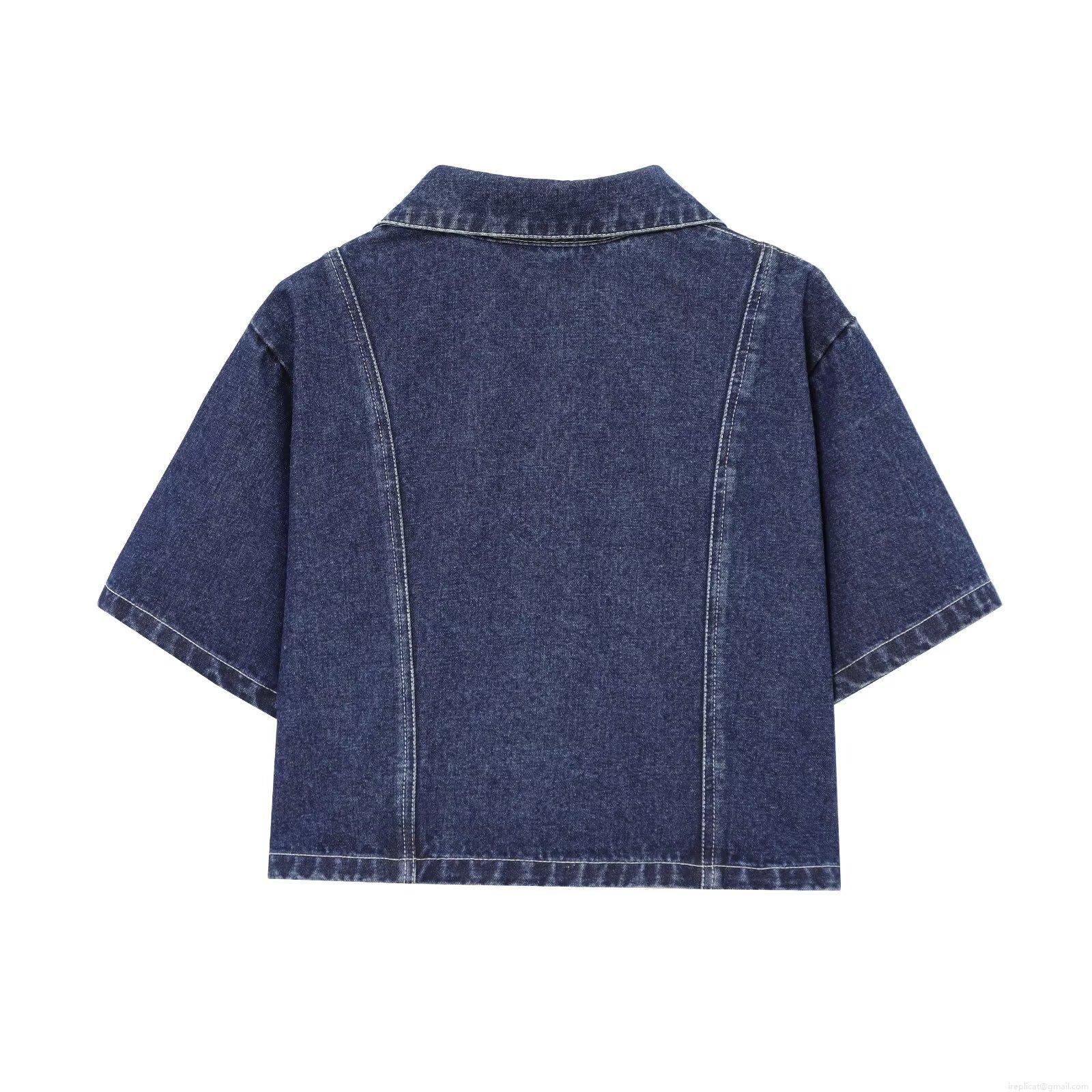 • Women's Two-Piece Denim Set Short Sleeve Button Up Jacket With Large Pockets And Asymmetric Wrap Skort Casual Streetwear Outfit Dark Blue Polyester Denim Fabric
