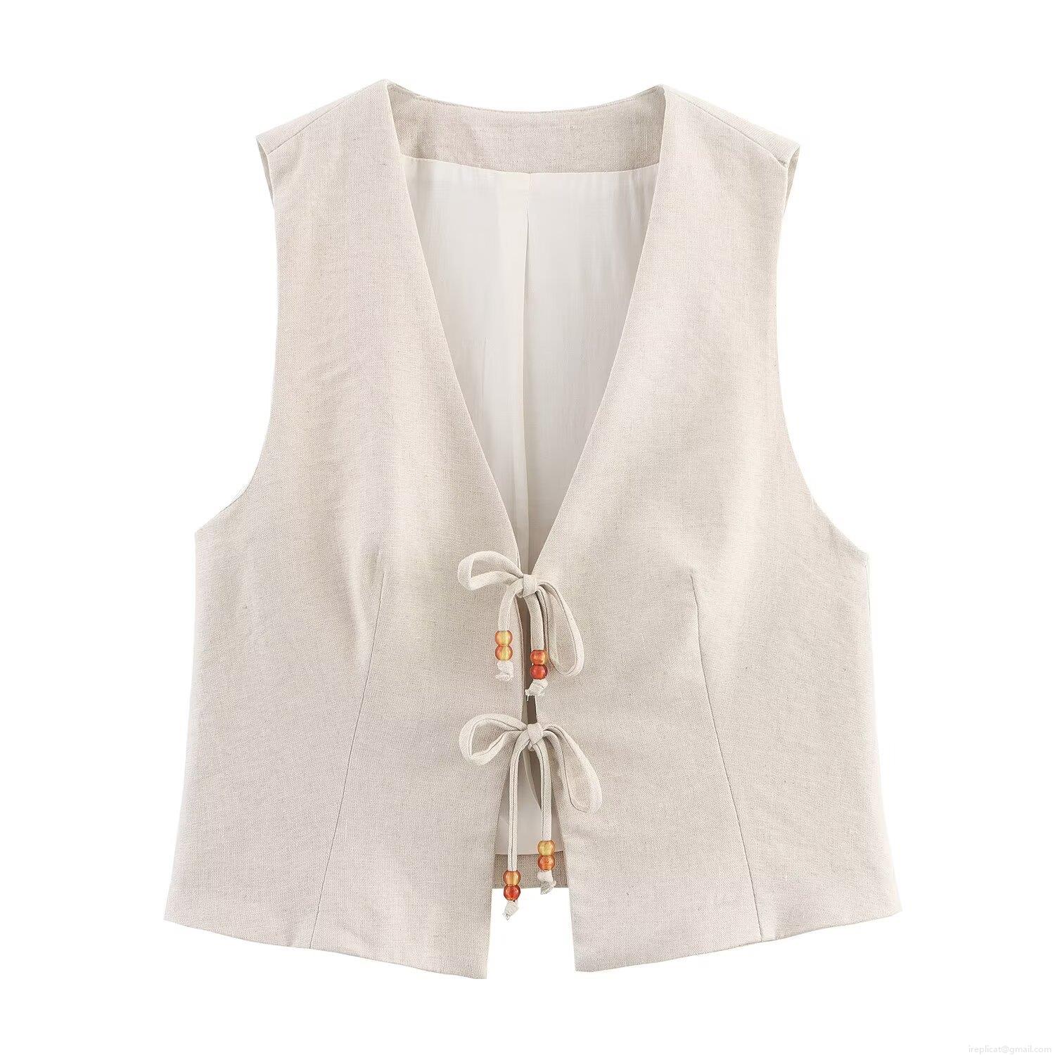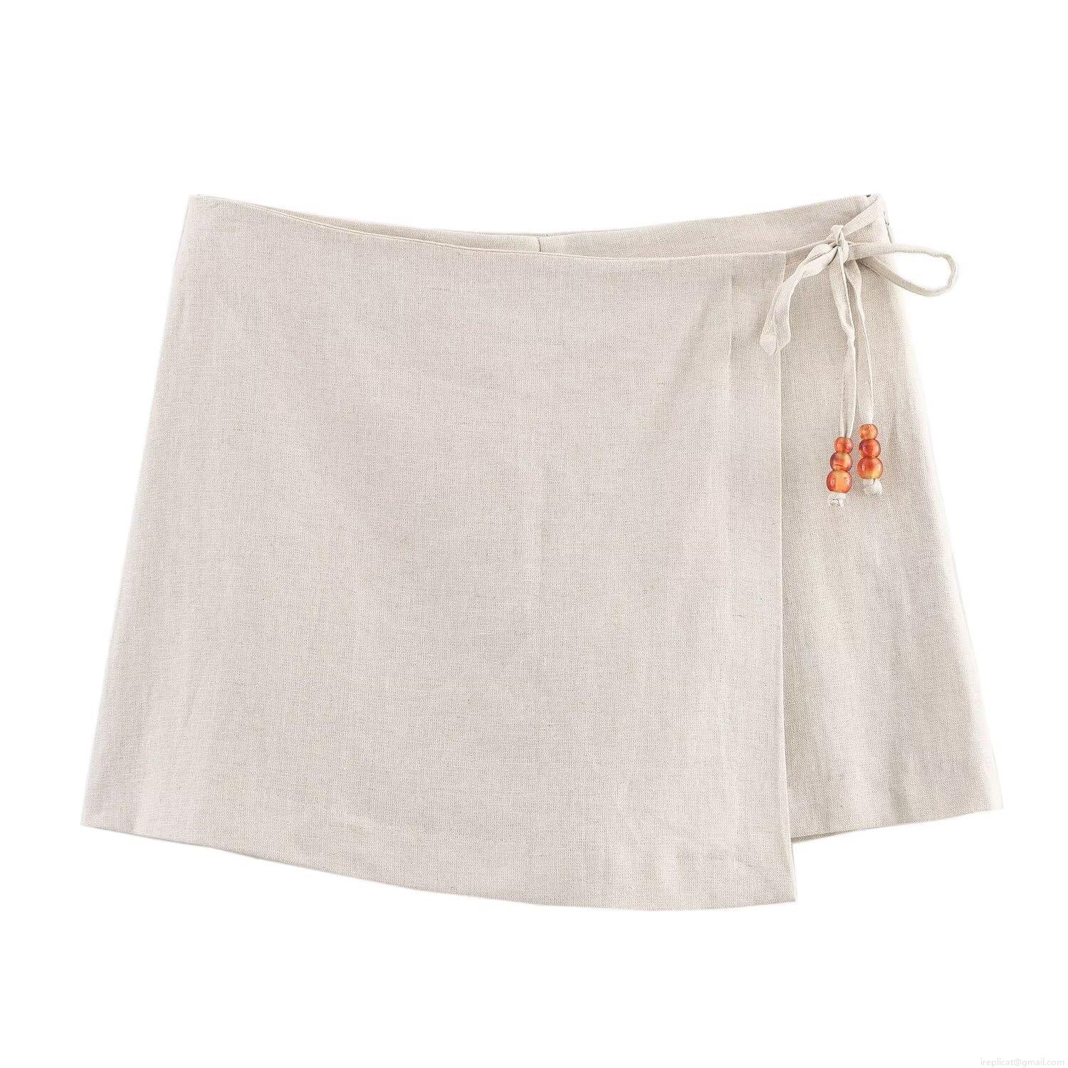 • Women's Two-Piece Linen Blend Set Deep V Neck Tie-Up Vest And Beaded Wrap Skort Oatmeal Bohemian Summer Beach Vacation Outfit