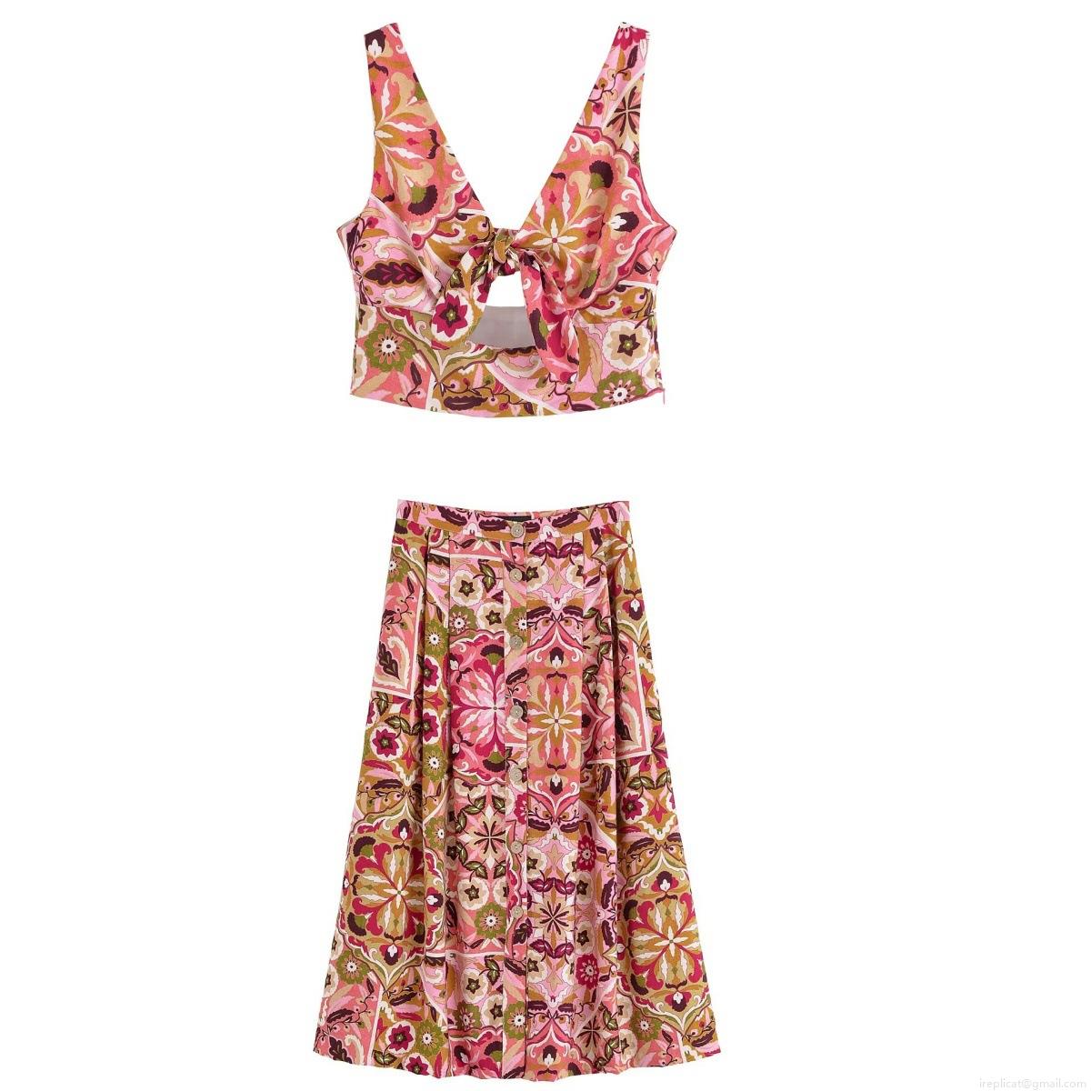 • Bohemian Paisley Print Two Piece Set Women V Neck Tie Knot Crop Top And Button Down A Line Midi Skirt Summer Vacation Beach Wear Outfit
