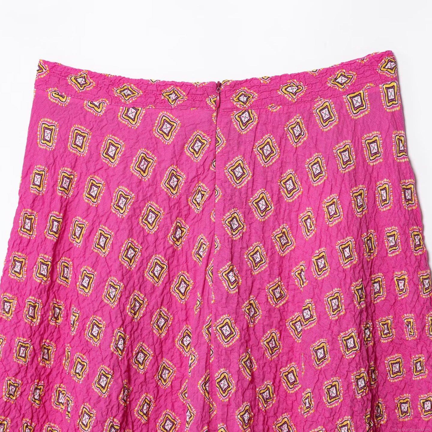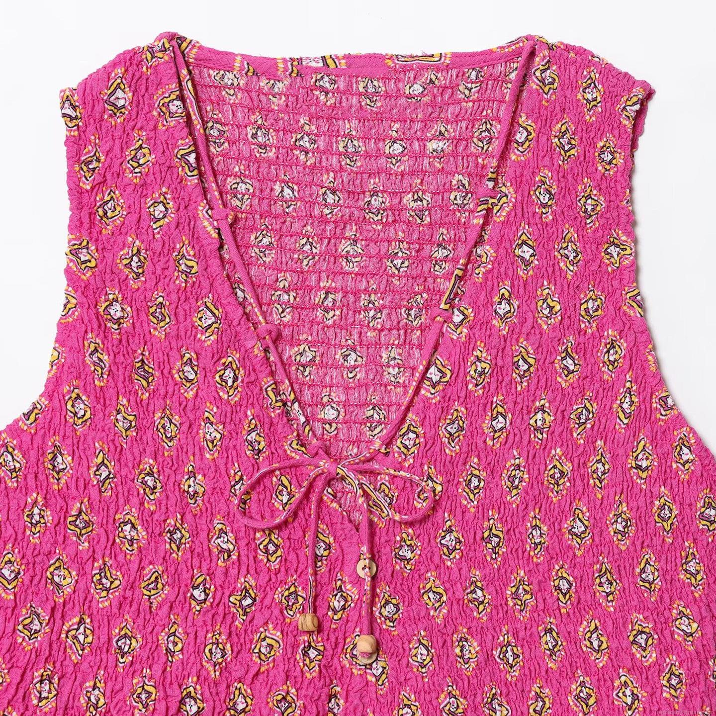 • Bohemian Women Fuchsia Geometric Diamond Print Smocked Top and Midi Skirt Set V-Neck Sleeveless Seersucker Two Piece Outfit With Wooden Beads for Summer Beach Travel Daily Casual