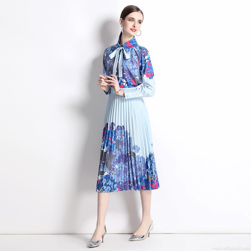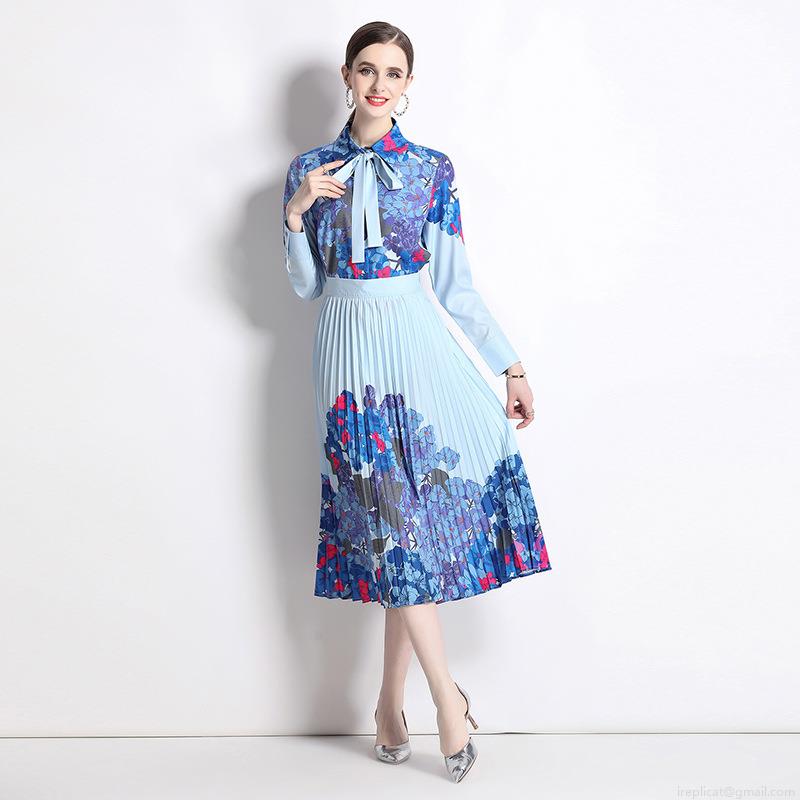 Elegant Blue Hydrangea Floral Print Skirt Set Women Long Sleeve Bow Tie Lapel Shirt High Waist Pleated Midi Skirt 2 Piece Vacation Party Outfit
