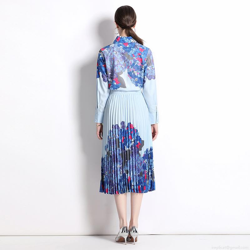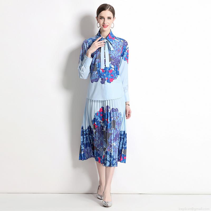 • Elegant Blue Hydrangea Floral Print Skirt Set Women Long Sleeve Bow Tie Lapel Shirt High Waist Pleated Midi Skirt 2 Piece Vacation Party Outfit