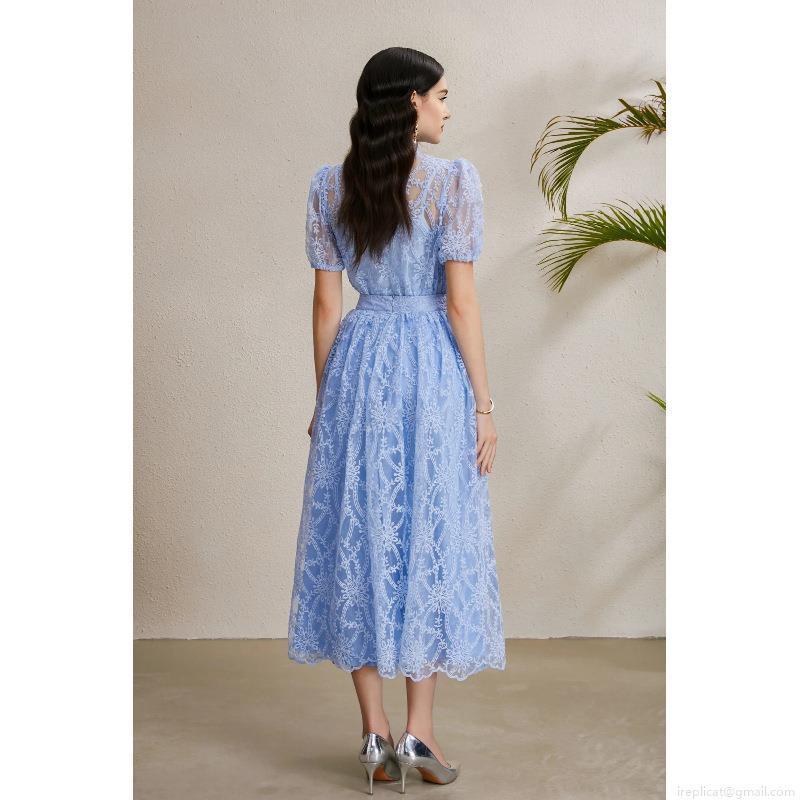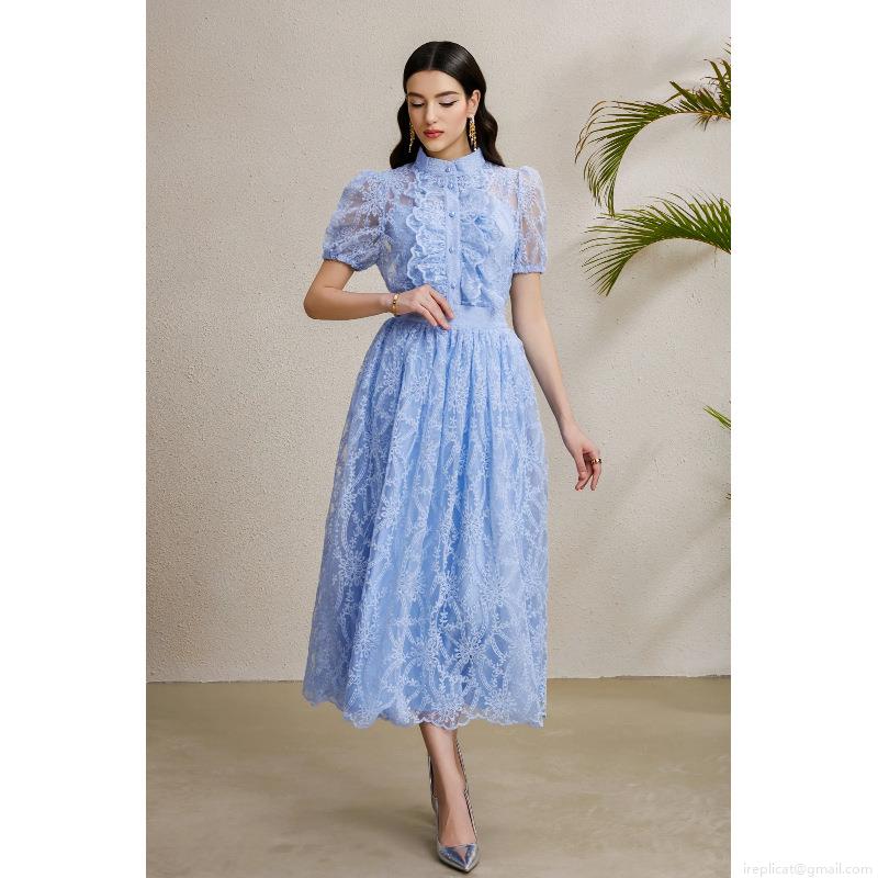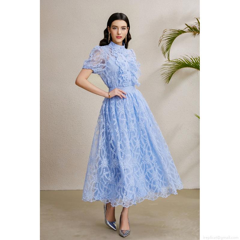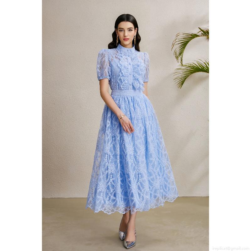 • Elegant Sky Blue Lace Two-Piece Skirt Set For Women Stand Collar Ruffle Button Down Puff Sleeve Top And High Waist A-Line Midi Skirt Vacation Party Office Lady Outfits