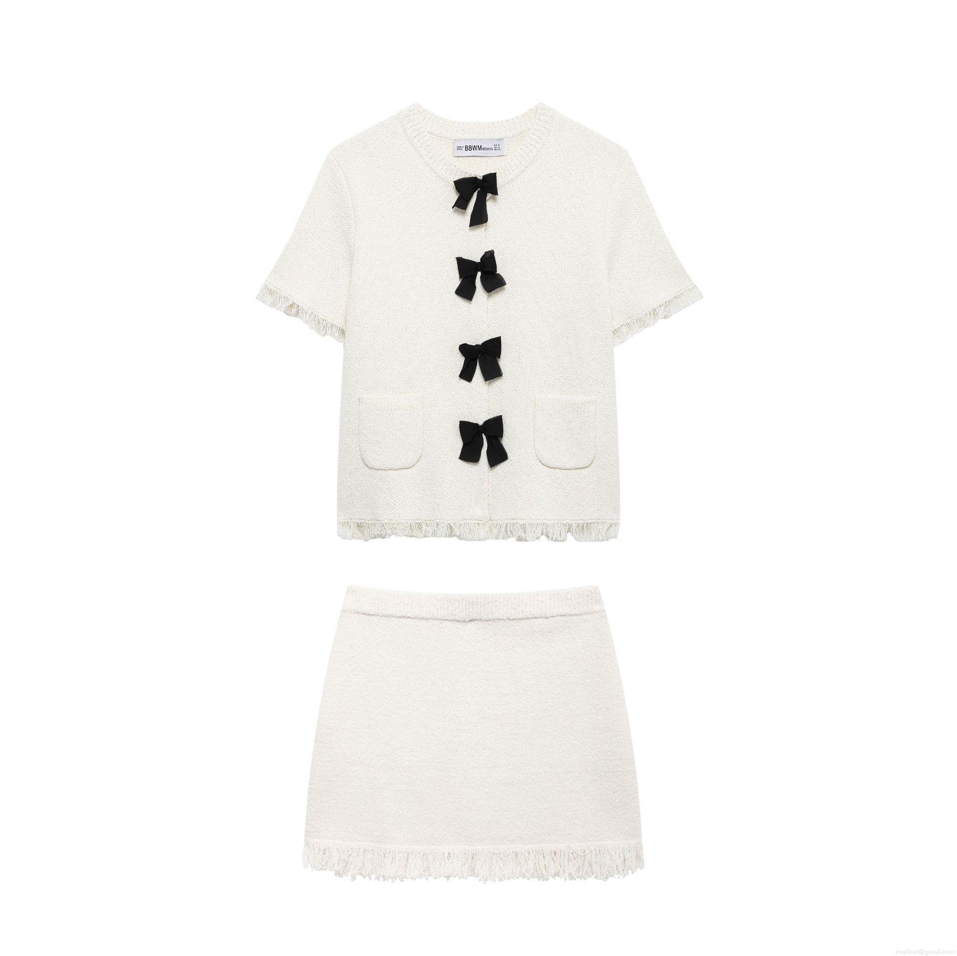 Elegant Tweed Two Piece Skirt Set For Women Sweet White Short Sleeve Crop Jacket With Black Bows And Tassel Mini Skirt Co-ords Party Outfit