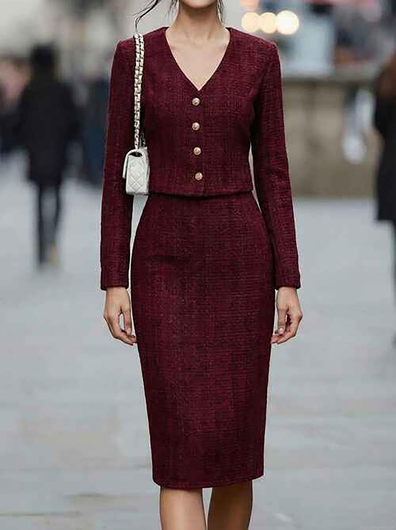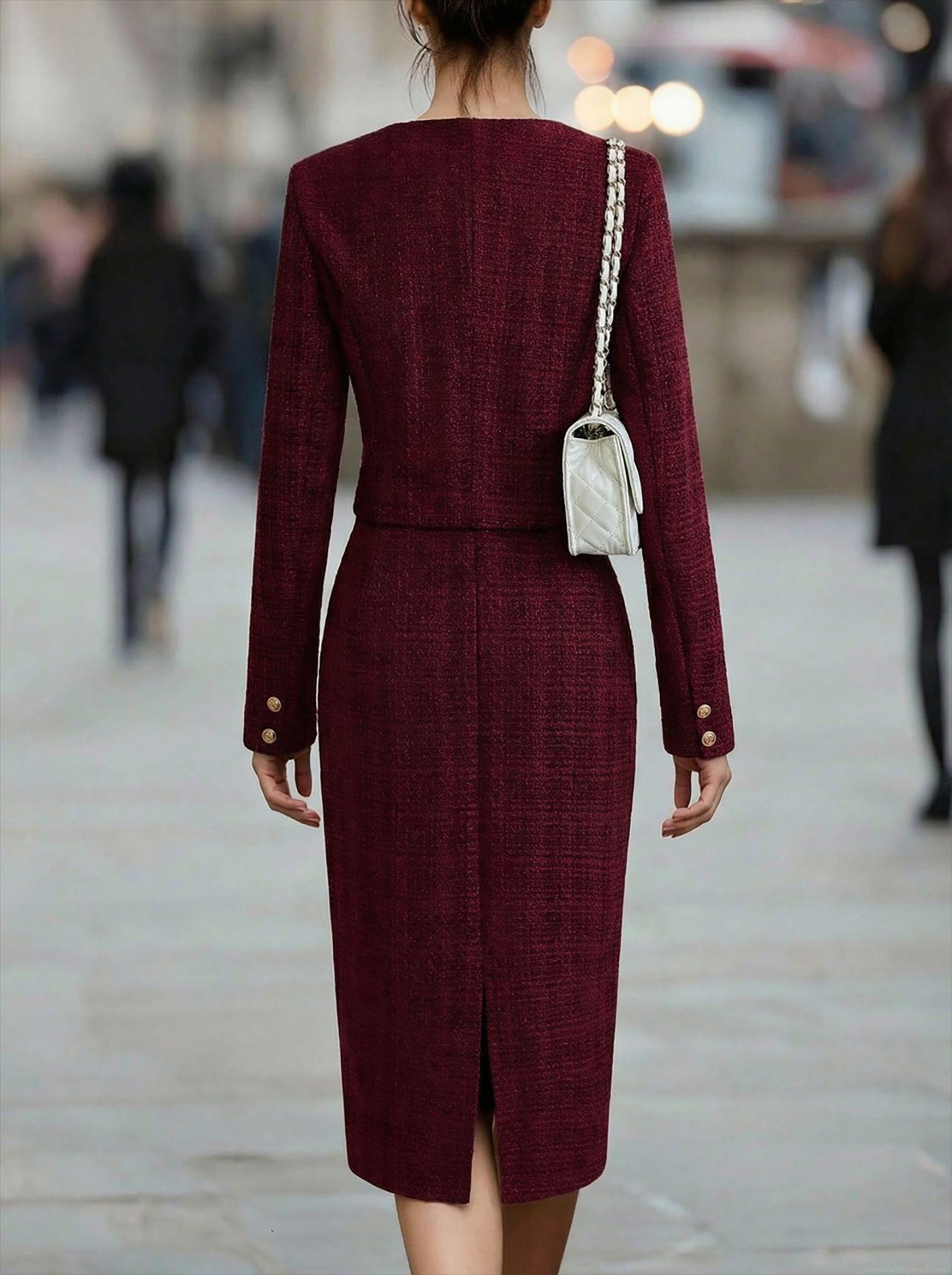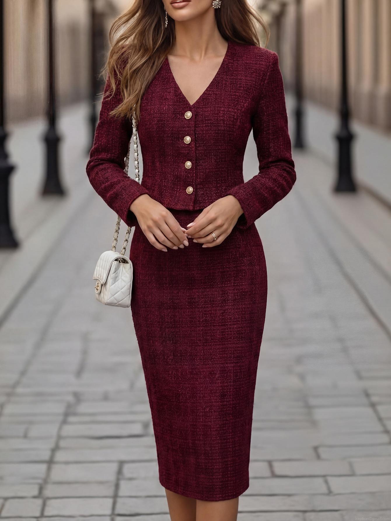 • Elegant Wine Red Tweed Two-Piece Skirt Set Women's V-Neck Slim Fit Long Sleeve Jacket and Mini Skirt Suits for Office Banquet Party Ladies