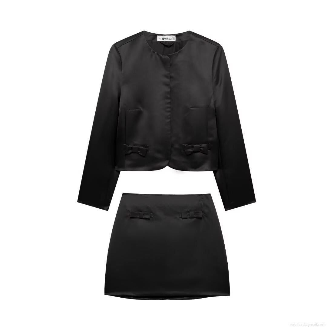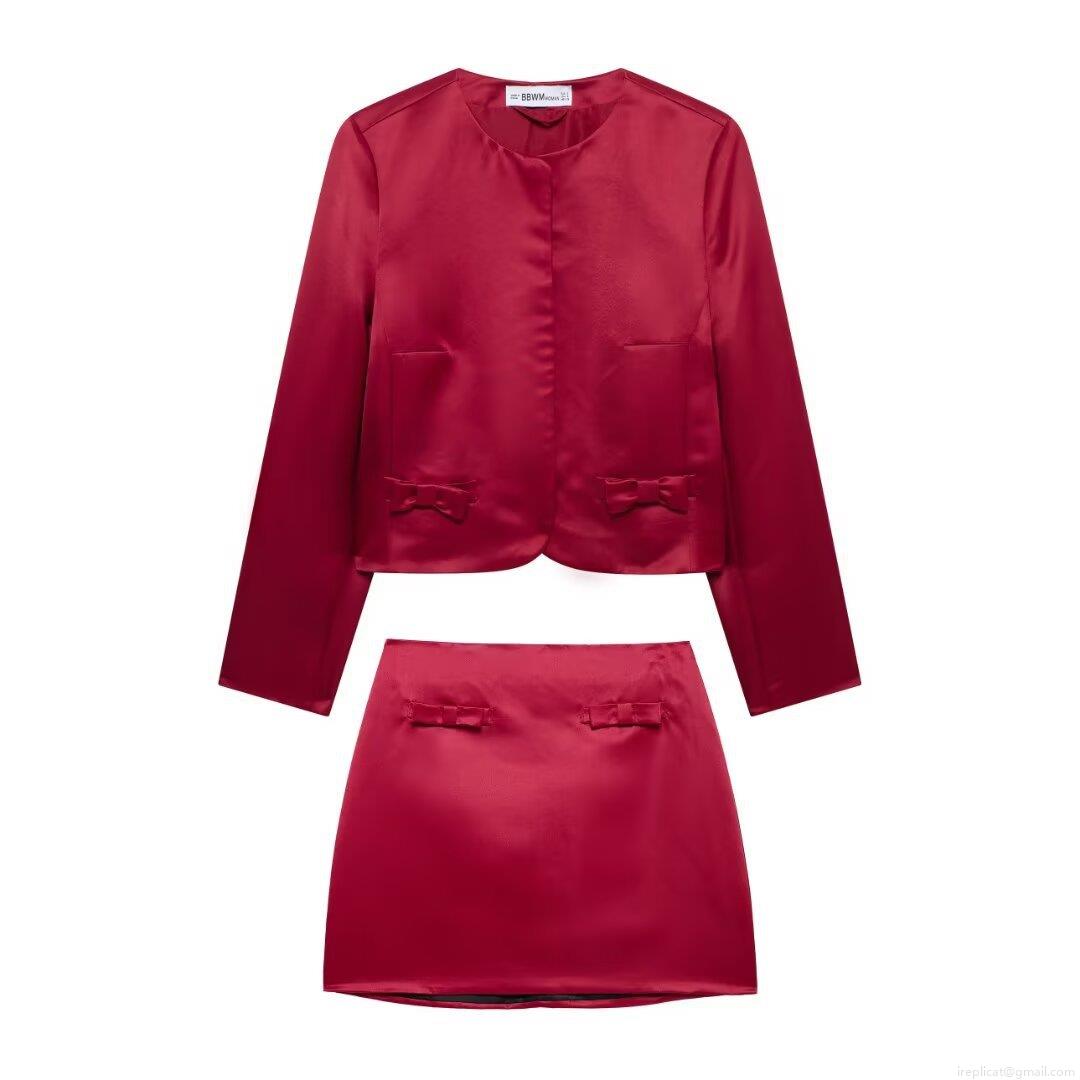 • Elegant Women's Satin Skirt Set Bow Knot Decor Long Sleeve Round Neck Jacket And Mini A-Line Skirt Two Piece Suit For Christmas Party Wedding Dating Sweet 100% Polyester Outfits