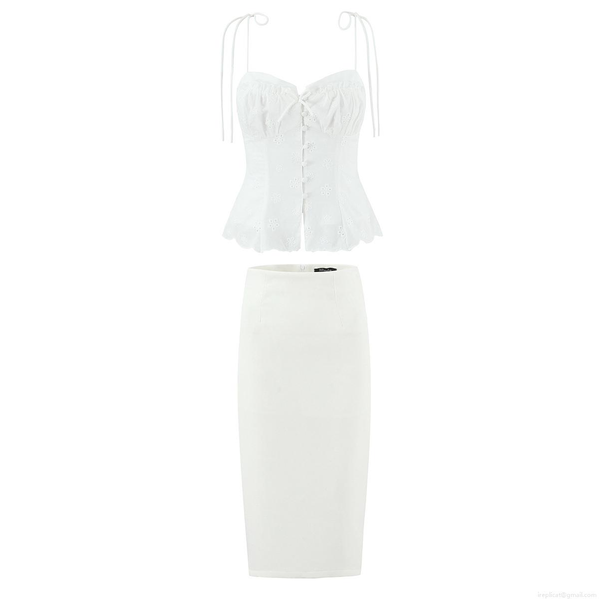 • Elegant Women's White Lace Embroidered Two Piece Skirt Set Eyelet Spaghetti Strap Cami Top and High Waist Midi Pencil Skirt Summer Party Outfit