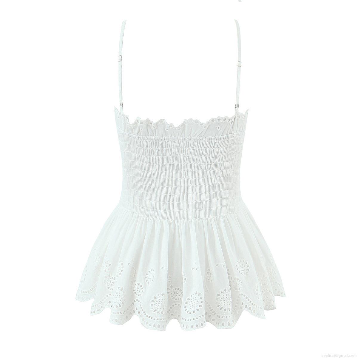 • French Women Two Piece Skirt Set White Cotton Eyelet Embroidery Smocking Cami Top and Tiered Ruffle Mini Skirt Sexy Sweet Summer Vacation Beach Outfits for Women