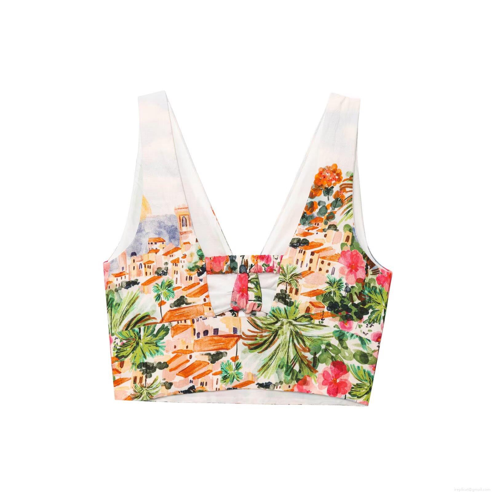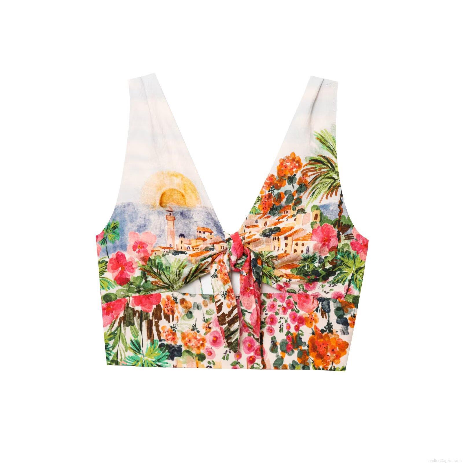 • Mediterranean Landscape Print Women's Two Piece Set V-Neck Tie Front Crop Top And High Waist Pleated Midi Skirt Summer Vacation Beach Outfits