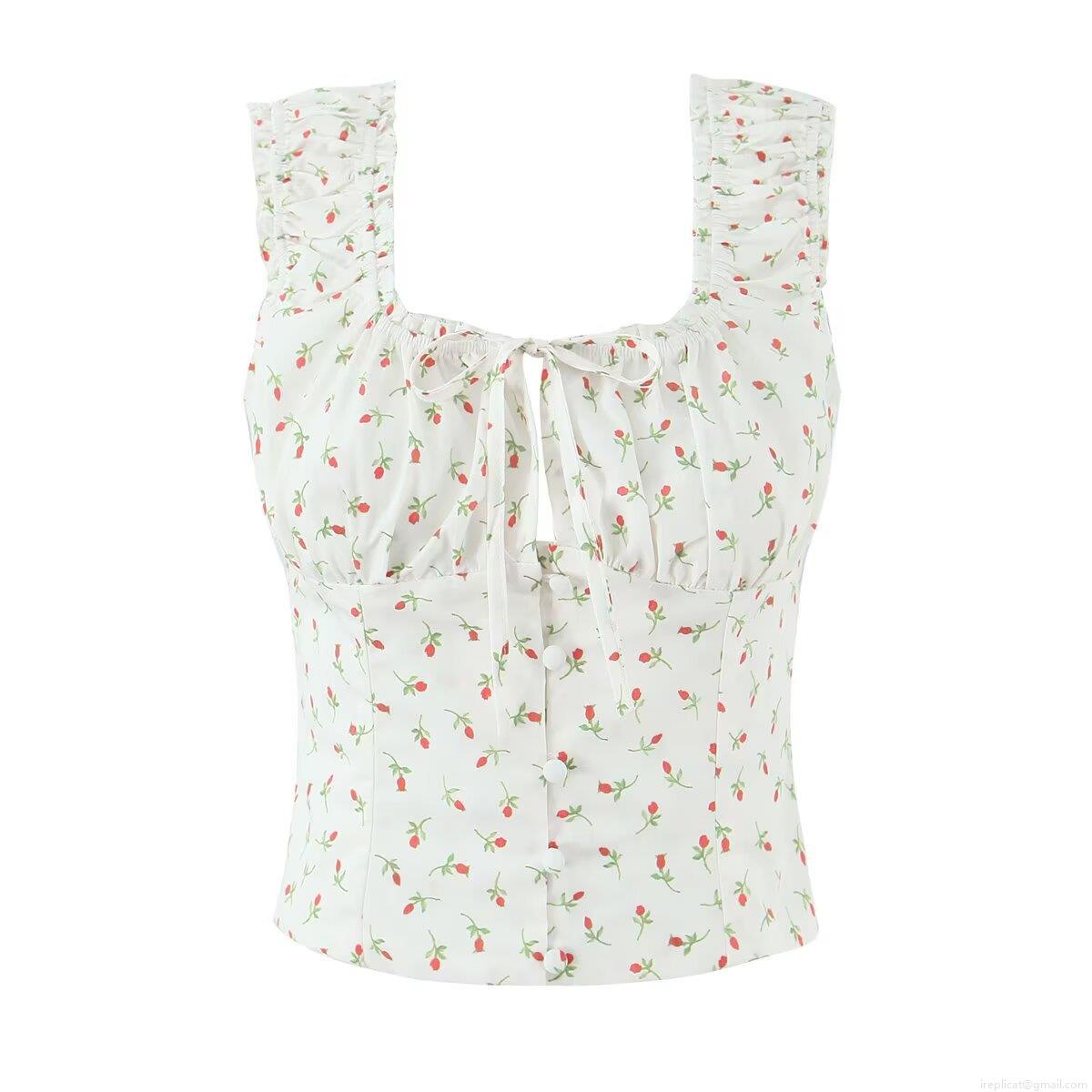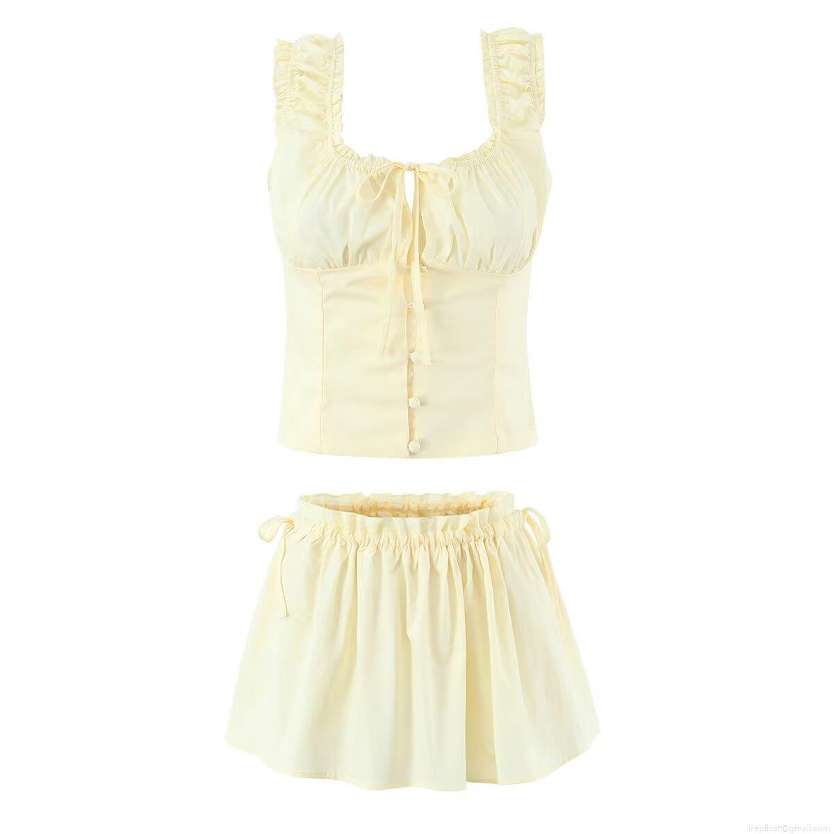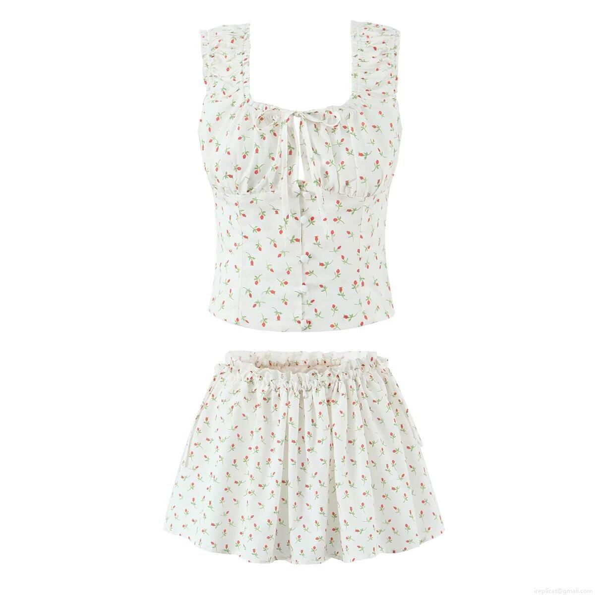 • Women 100% Cotton Floral Ruffle Crop Top And Mini Skirt Set Square Neck Lace-up Button Smocked High Waist Skirt Summer Vacation Beachwear Two Piece Outfit