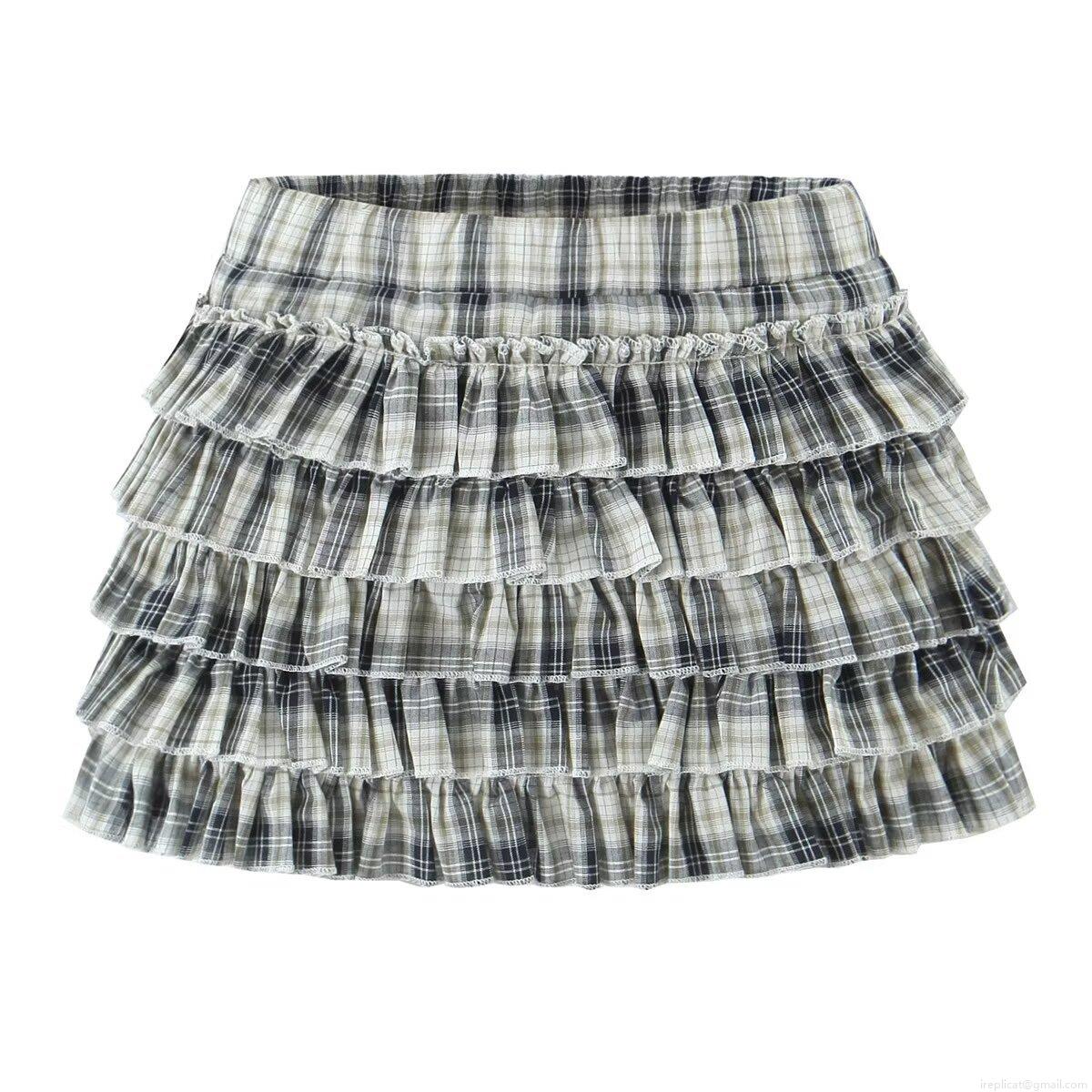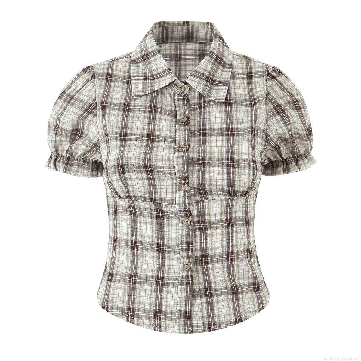 Women 100 Percent Cotton Plaid 2 Piece Set Puff Sleeve Button Down Shirt Waist Cinching Top And Multi Layered Ruffle Cake Skirt Summer Casual Outfit