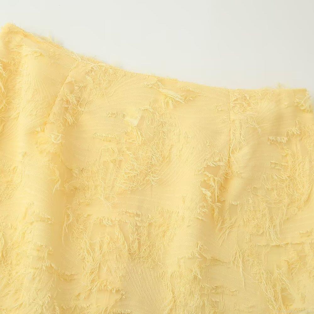 Women 2 Piece Skirt Set Elegant V-Neck Long Sleeve Top And Mini Skirt Feather Tassel Jacquard Texture Outfits Sweet Summer Fashion Suits