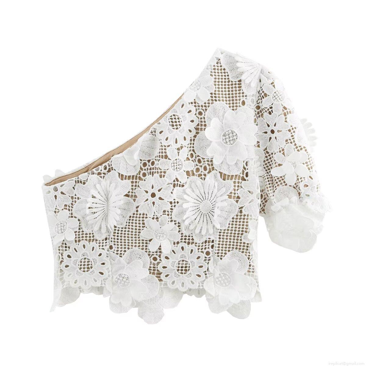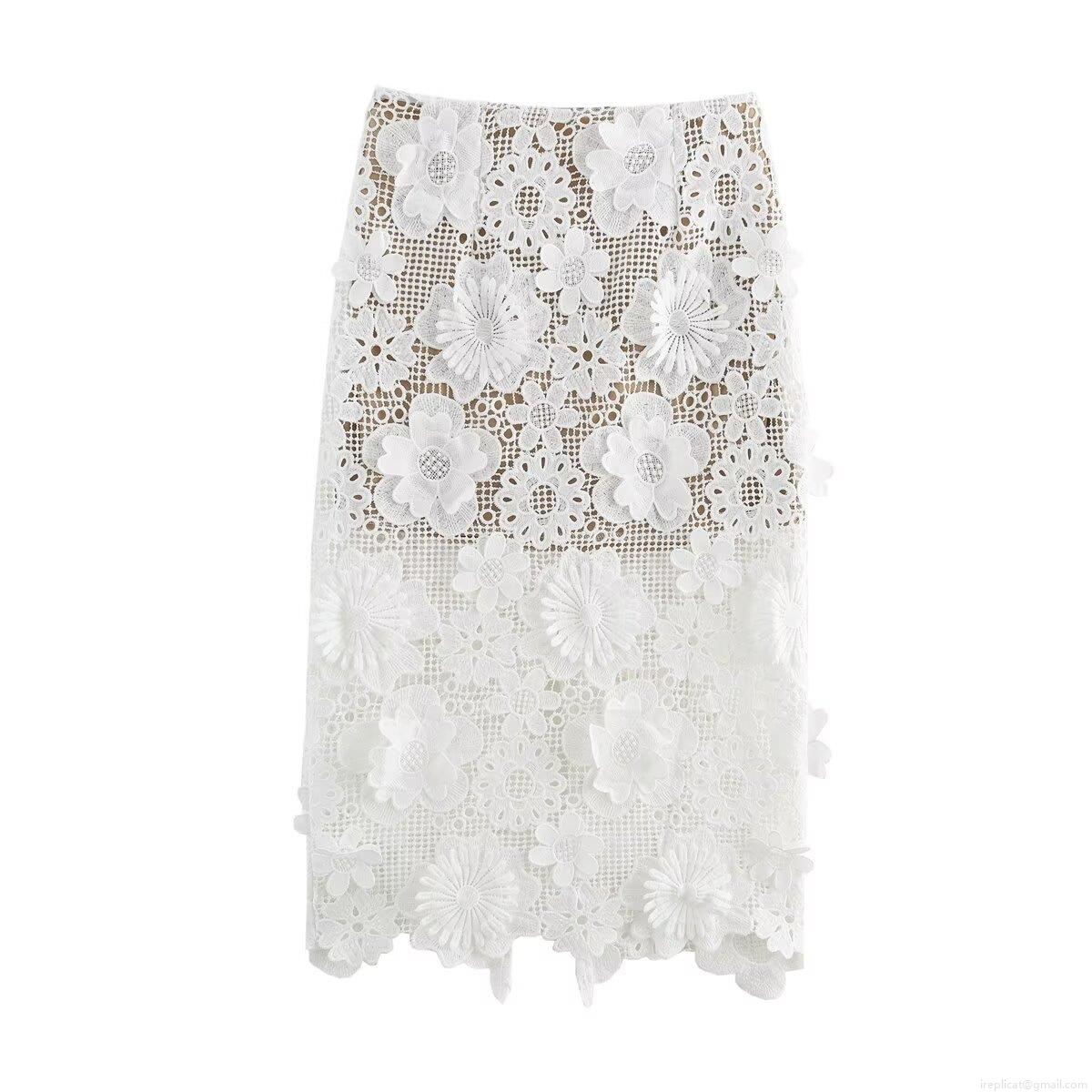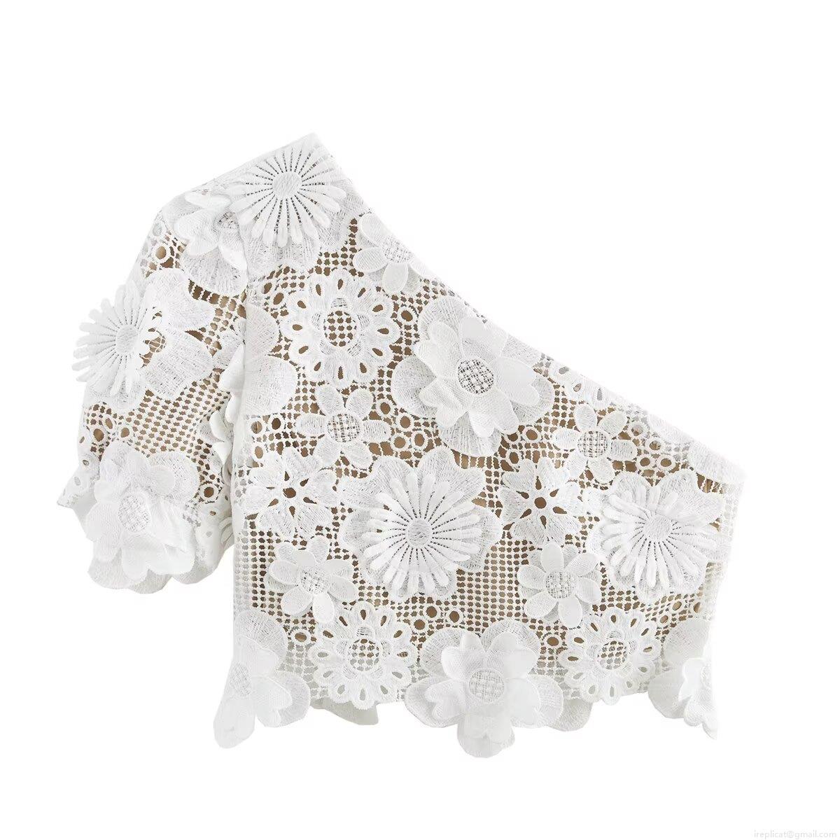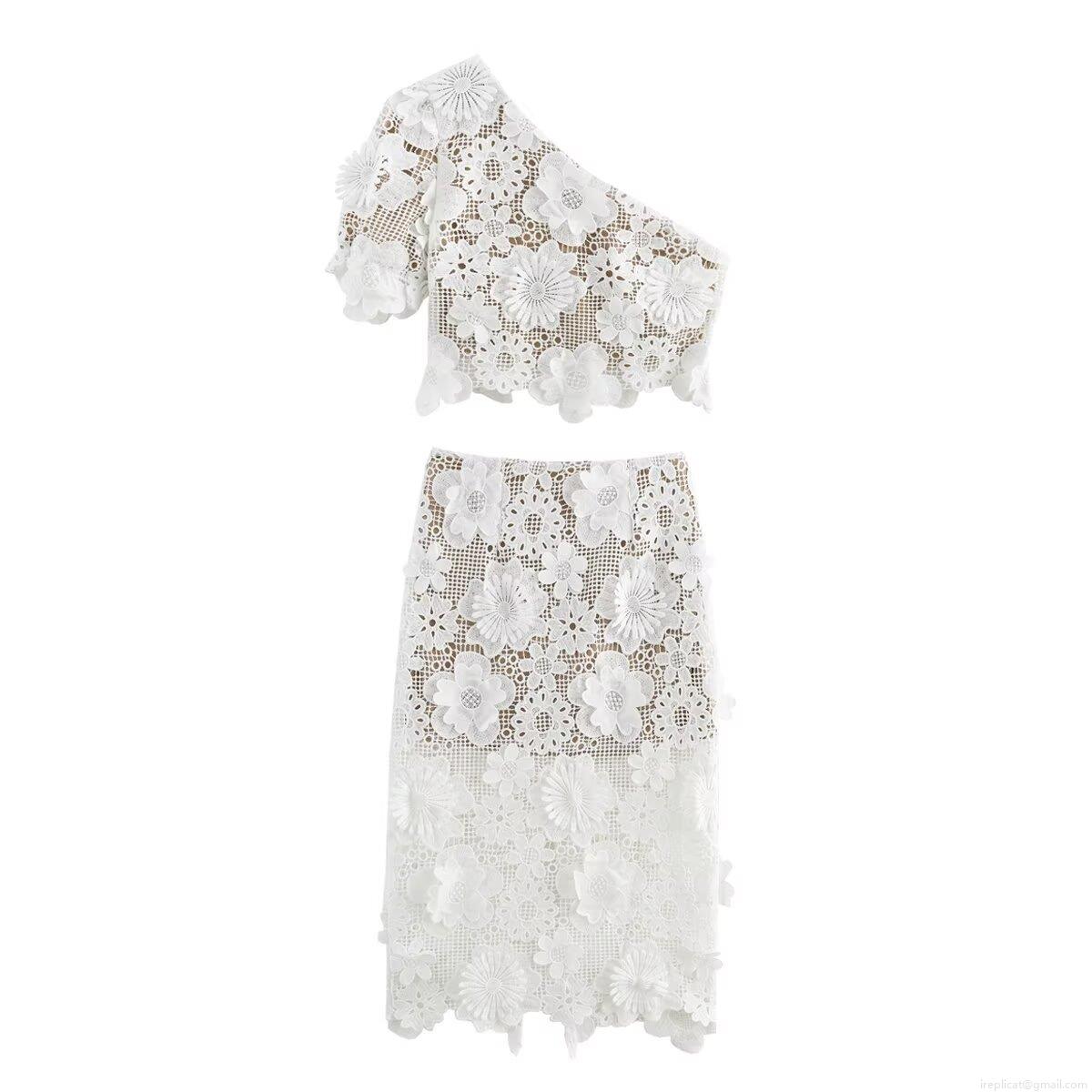 • Women 3D Floral Lace One Shoulder Top and Midi Skirt Set Elegant White Crochet Two Piece Outfits for Party Streetwear