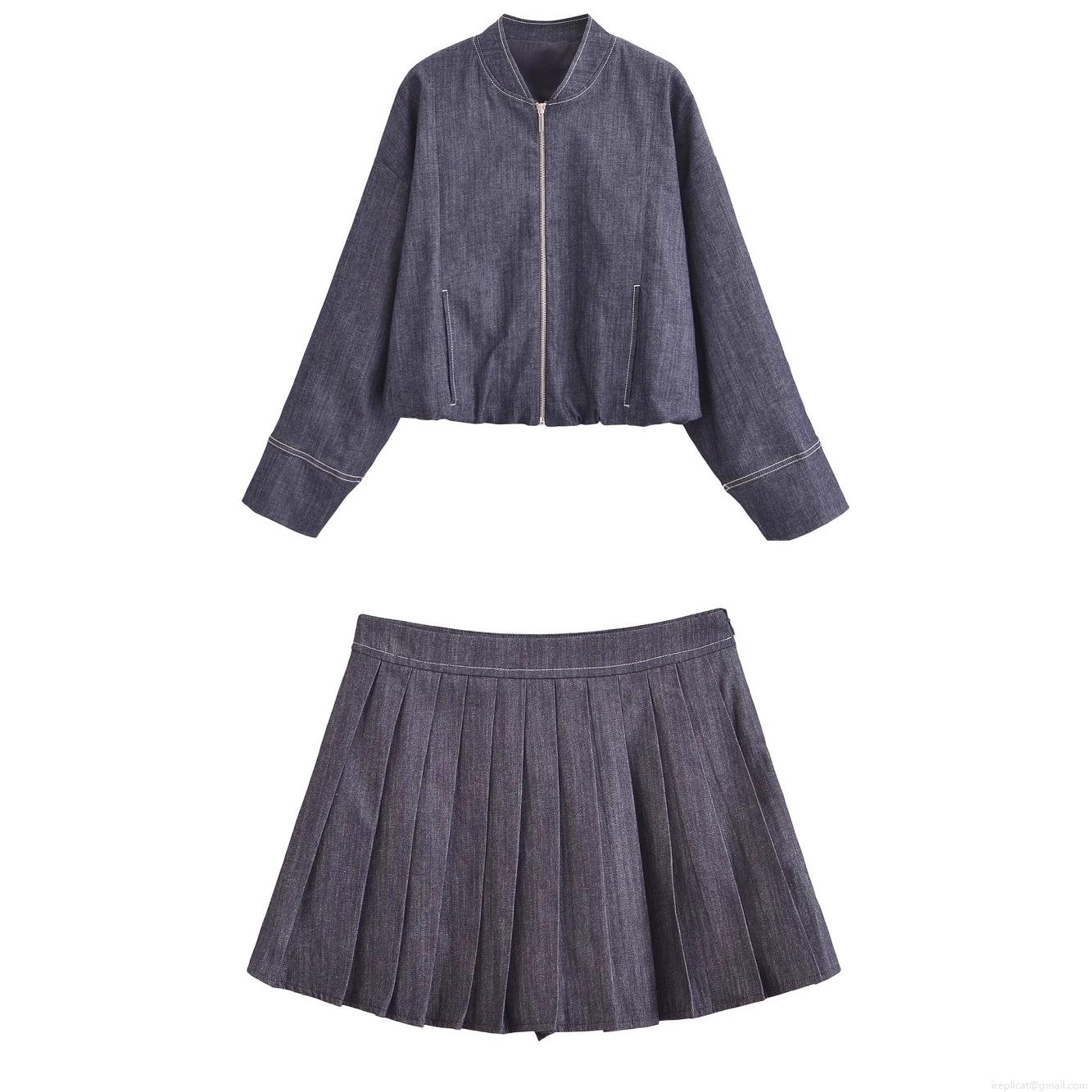 • Women Denim Style 2 Piece Set Navy Blue Zip Up Bomber Jacket with High Waist Pleated Mini Skirt Casual Streetwear Outfits for Spring Autumn