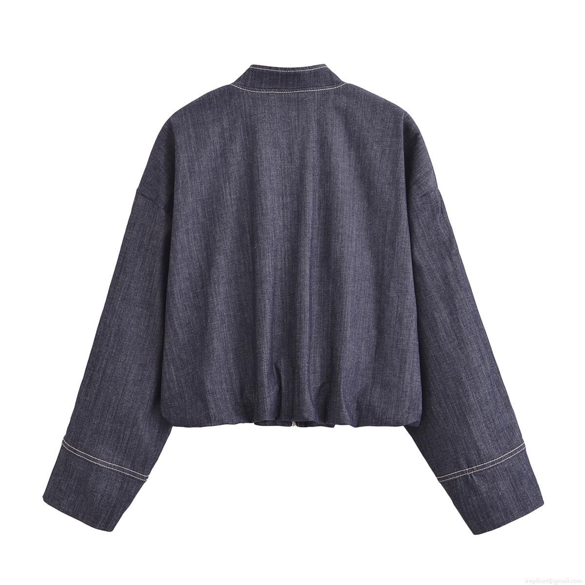 Women Denim Style 2 Piece Set Navy Blue Zip Up Bomber Jacket with High Waist Pleated Mini Skirt Casual Streetwear Outfits for Spring Autumn