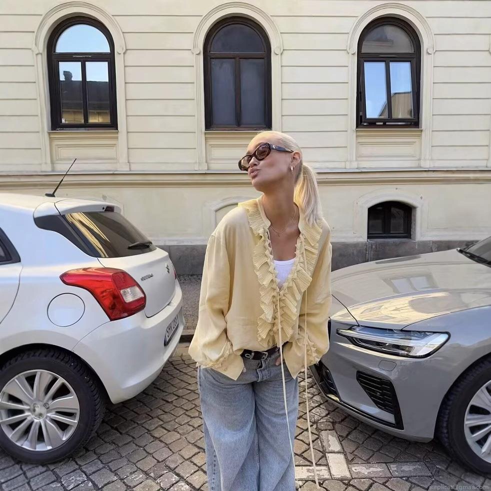 Women Elegant Light Yellow Chiffon Ruffle Long Sleeve Shirt and High Slit Pleated Skirt Set Casual Two Piece Outfits for Vacation Beach Party Streetwear Women
