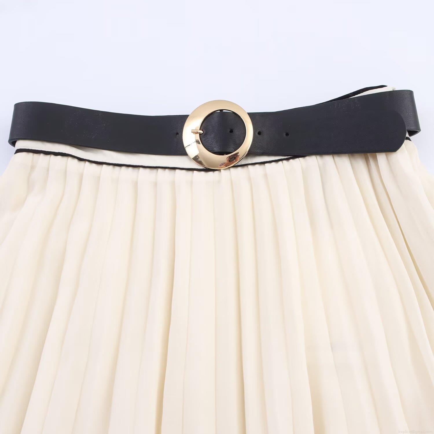 Women Elegant Off-White Chiffon Pleated Two-Piece Set Sleeveless V-Neck Top And Mid-Length Skirt With Black Belt Summer Commuter Solid Color Outfit