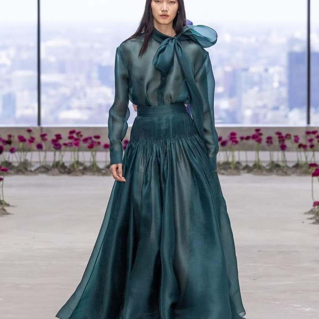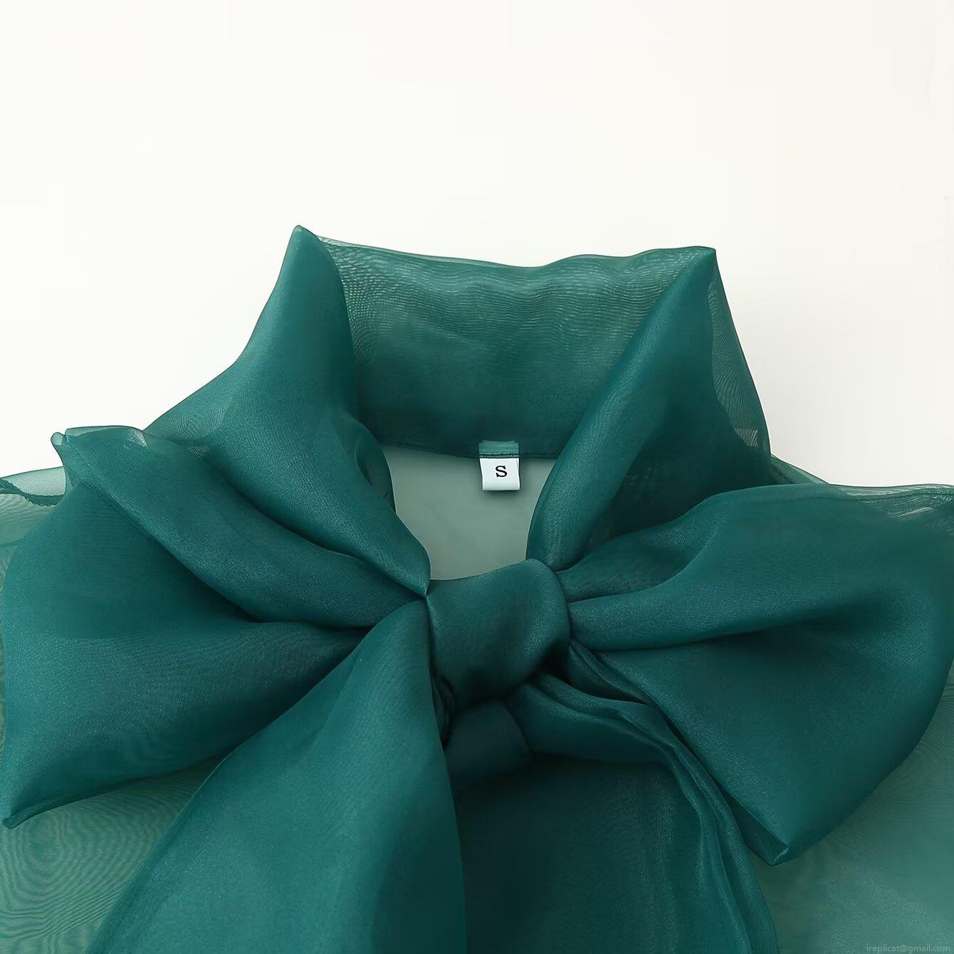 • Women Elegant Organza Two Piece Skirt Set Long Sleeve Bow Tie Shirt And High Waist Shirred Maxi Skirt Dark Green Solid Color Translucent Celebrity Style Party Evening Outfit
