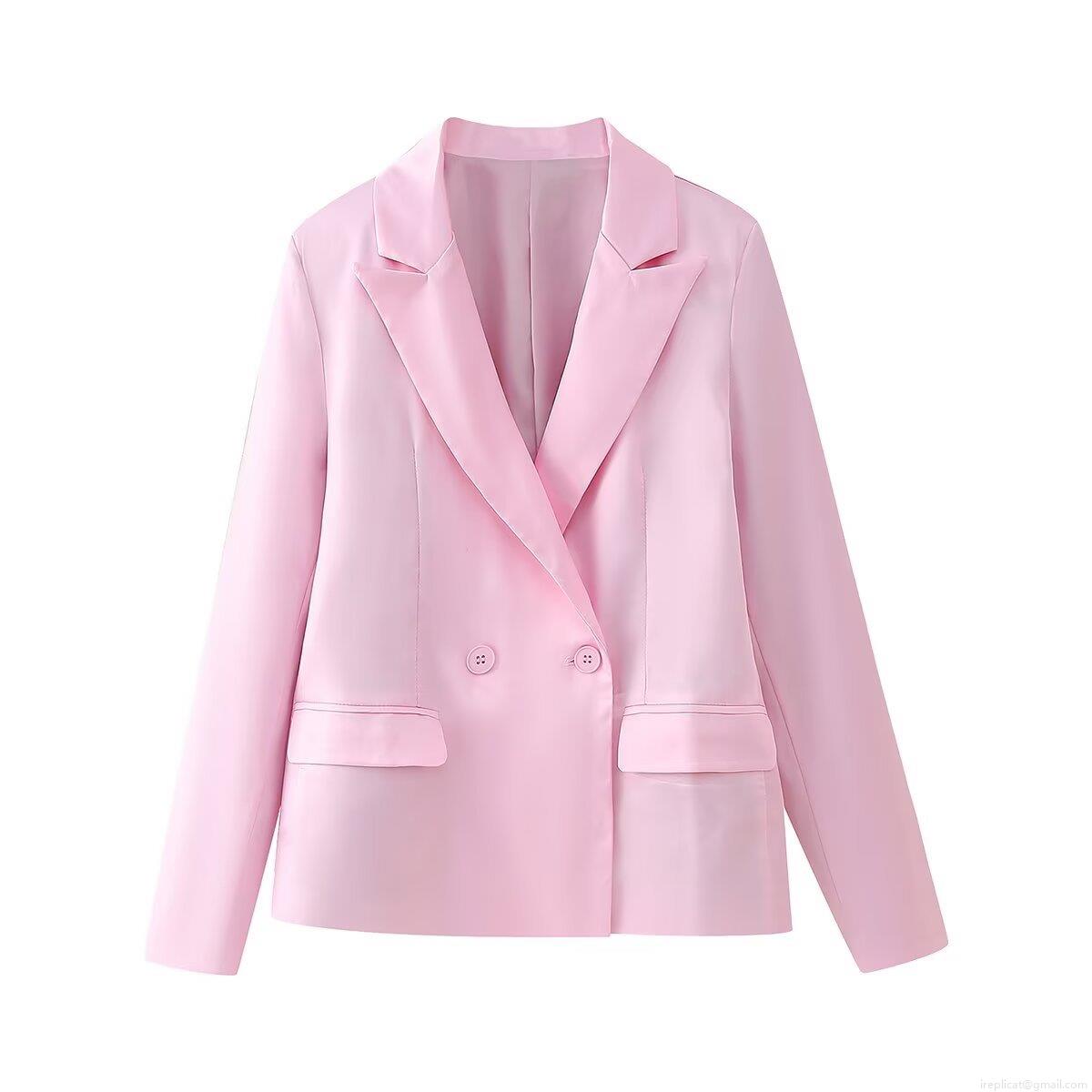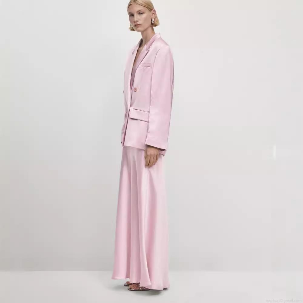 • Women Elegant Satin Blazer And Long Skirt Two Piece Set Double Breasted Pink Jacket A-Line Maxi Skirt Office Commute Suit
