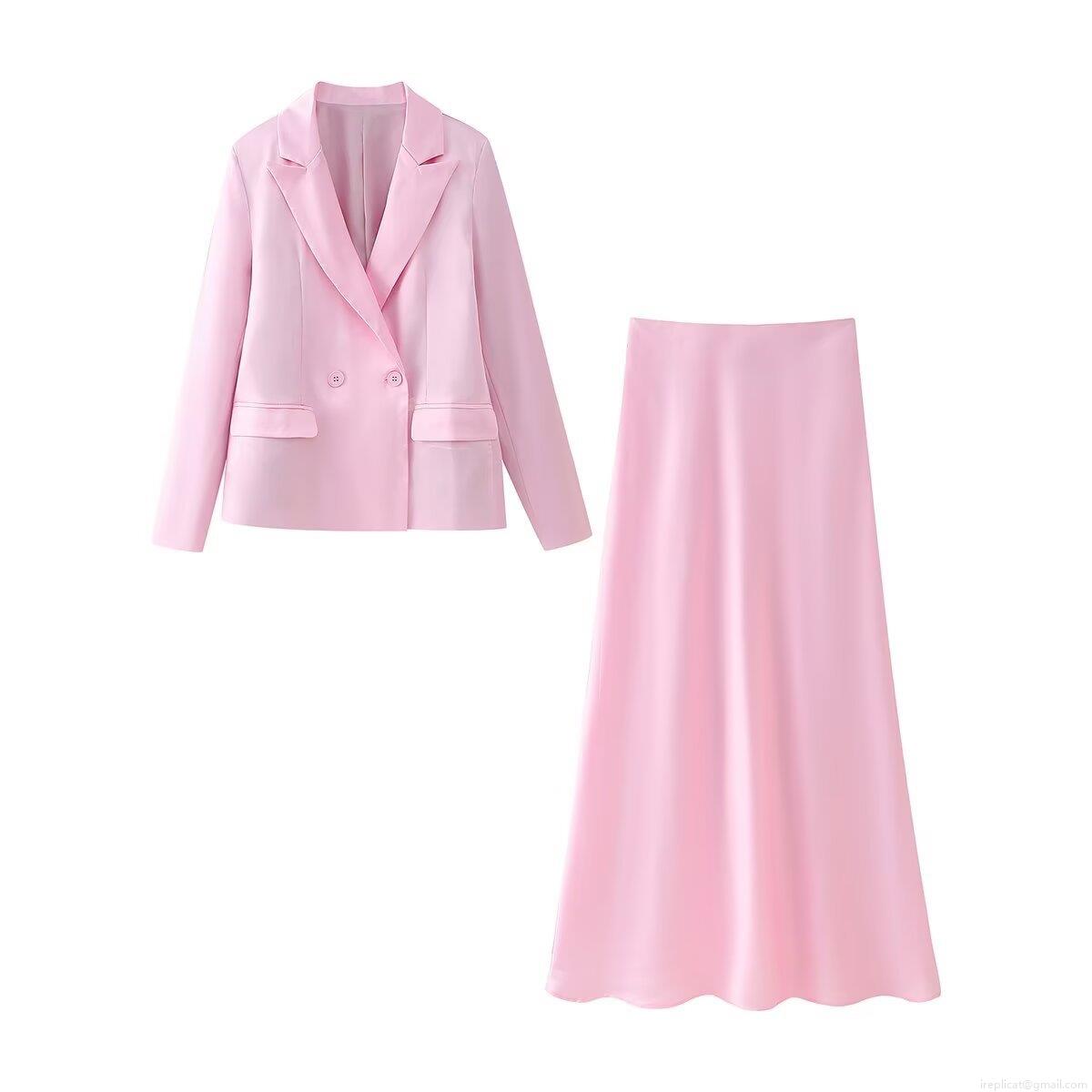 Women Elegant Satin Blazer And Long Skirt Two Piece Set Double Breasted Pink Jacket A-Line Maxi Skirt Office Commute Suit