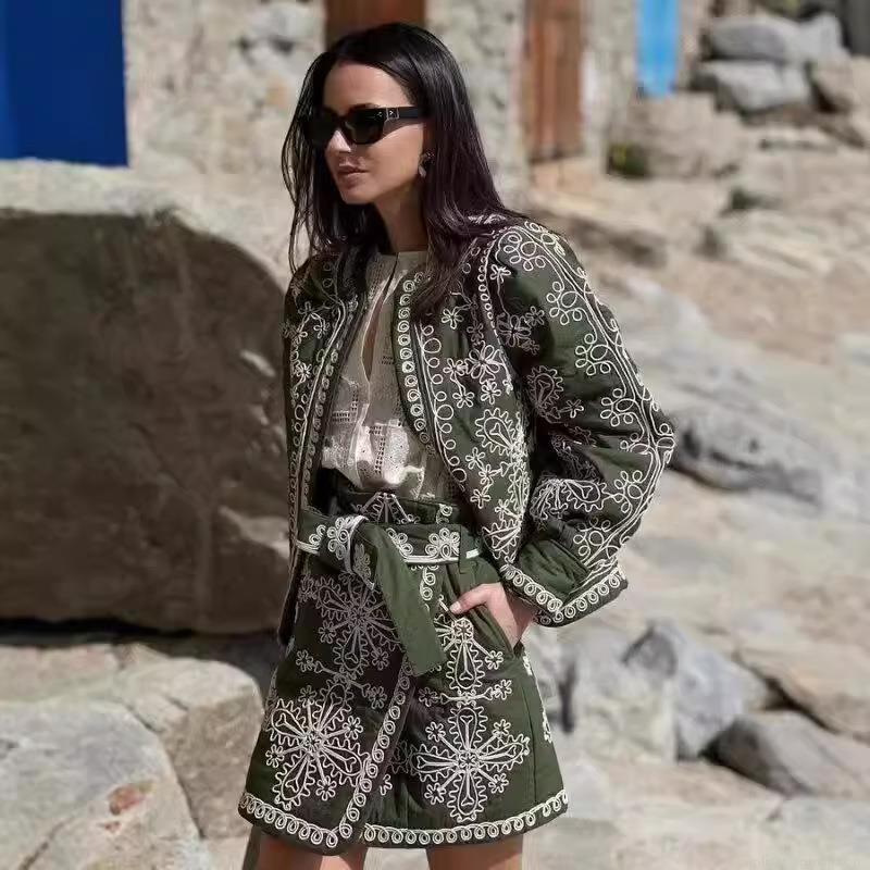 Women Ethno Embroidery Quilted Jacket and Short Skirt Set With Belt Vintage Dark Green Paisley Floral Two Piece Outfits For Autumn Winter Women Casual Wear