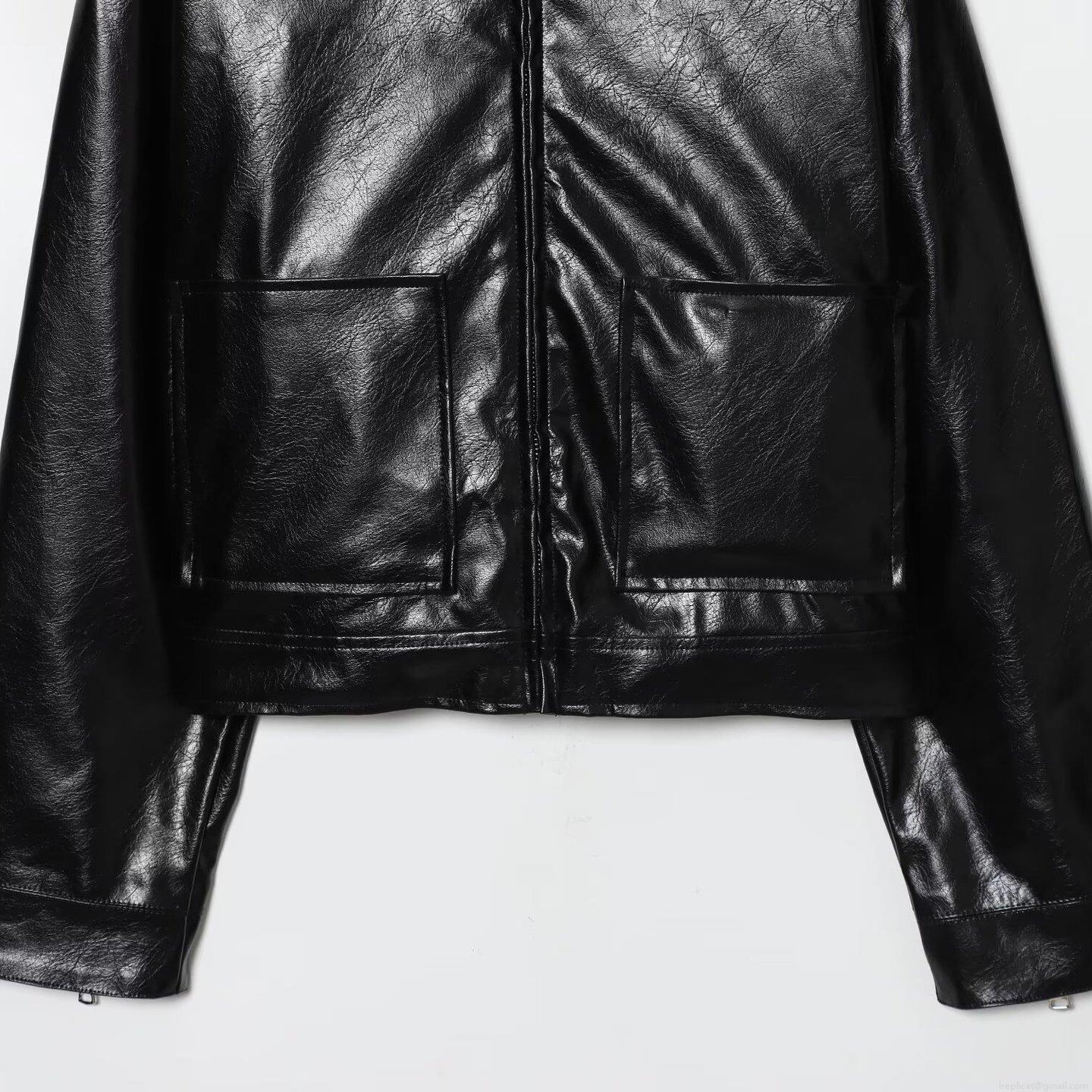 • Women Fashion Black Faux Leather Two Piece Set Short PU Jacket With Lapel Pocket And Mini Skirt Casual Long Sleeve PU Outwear Suit For Women