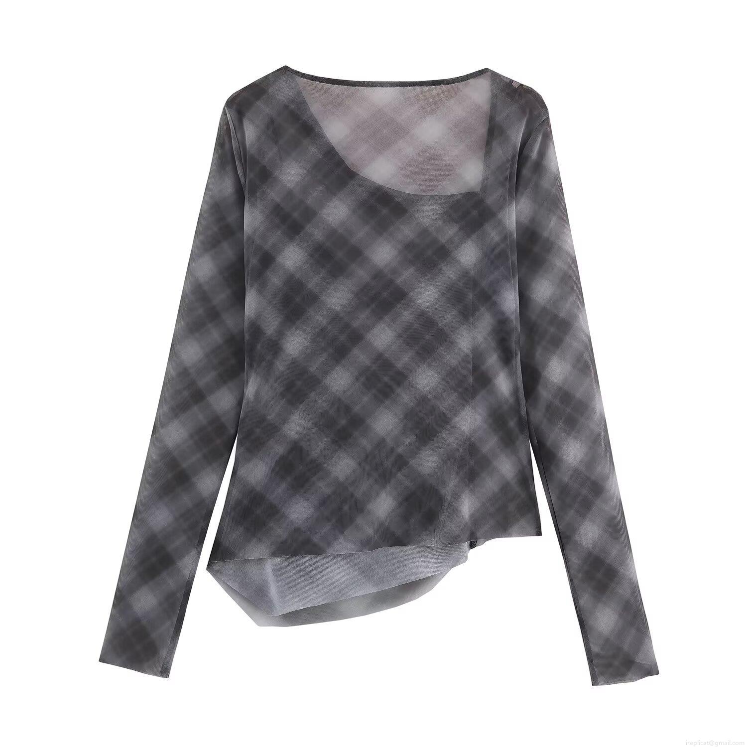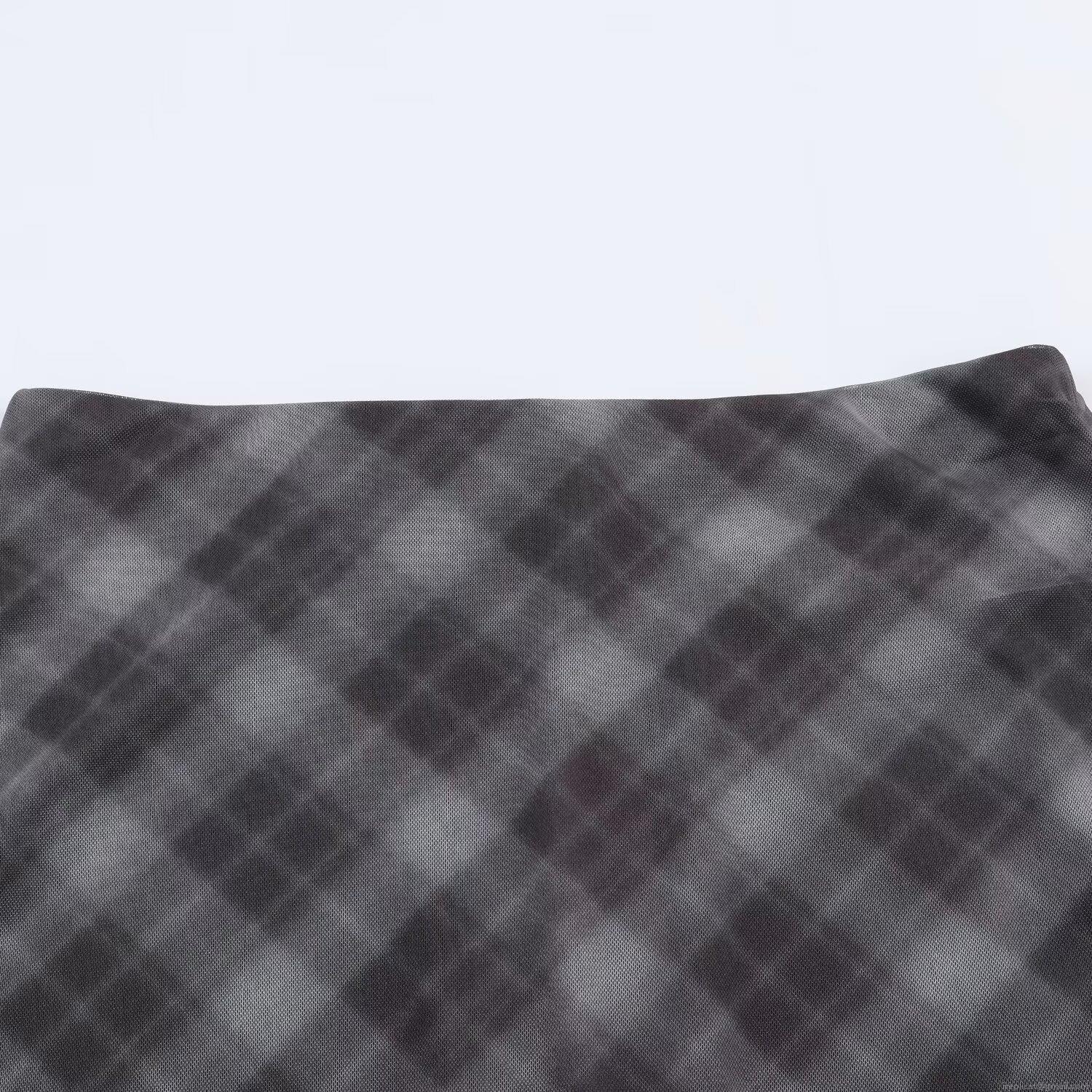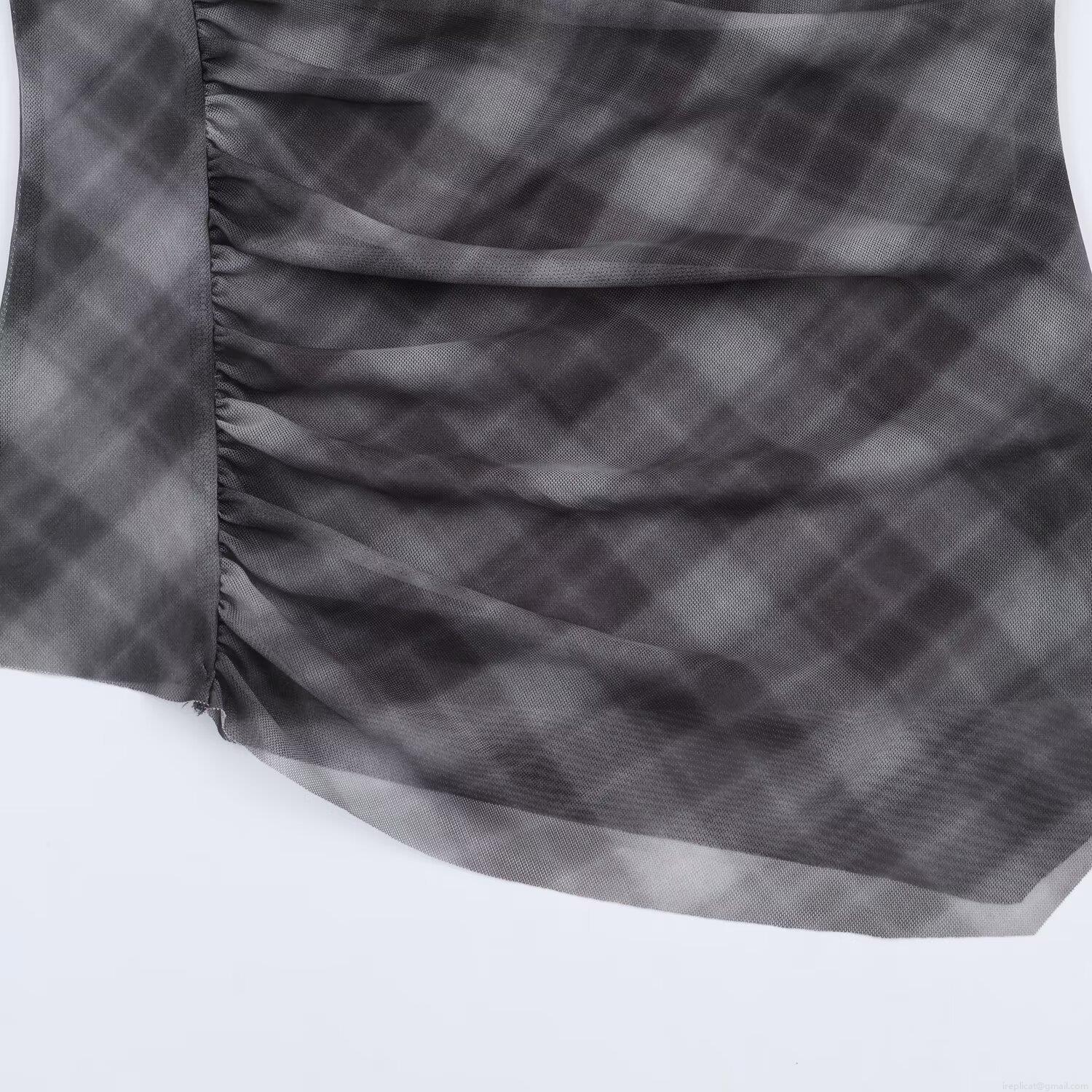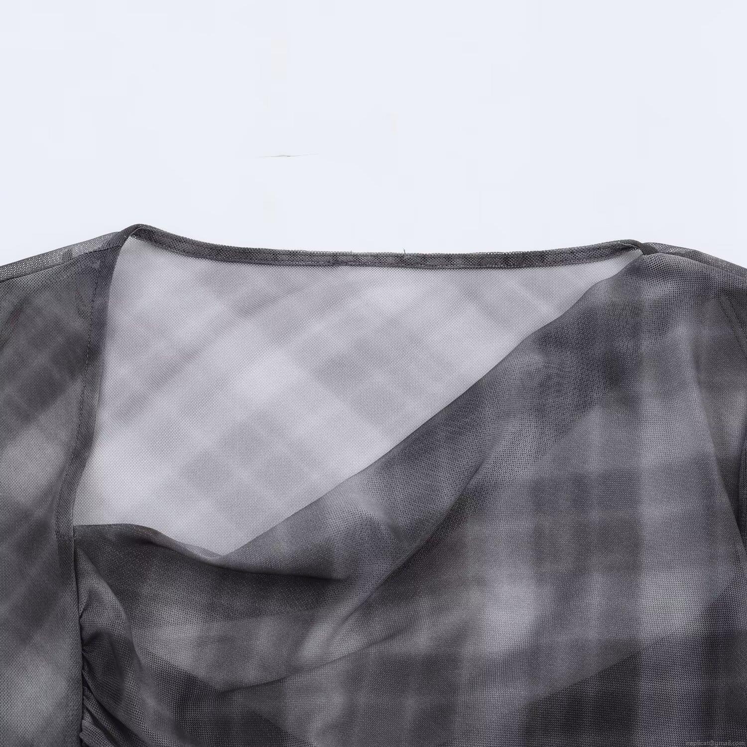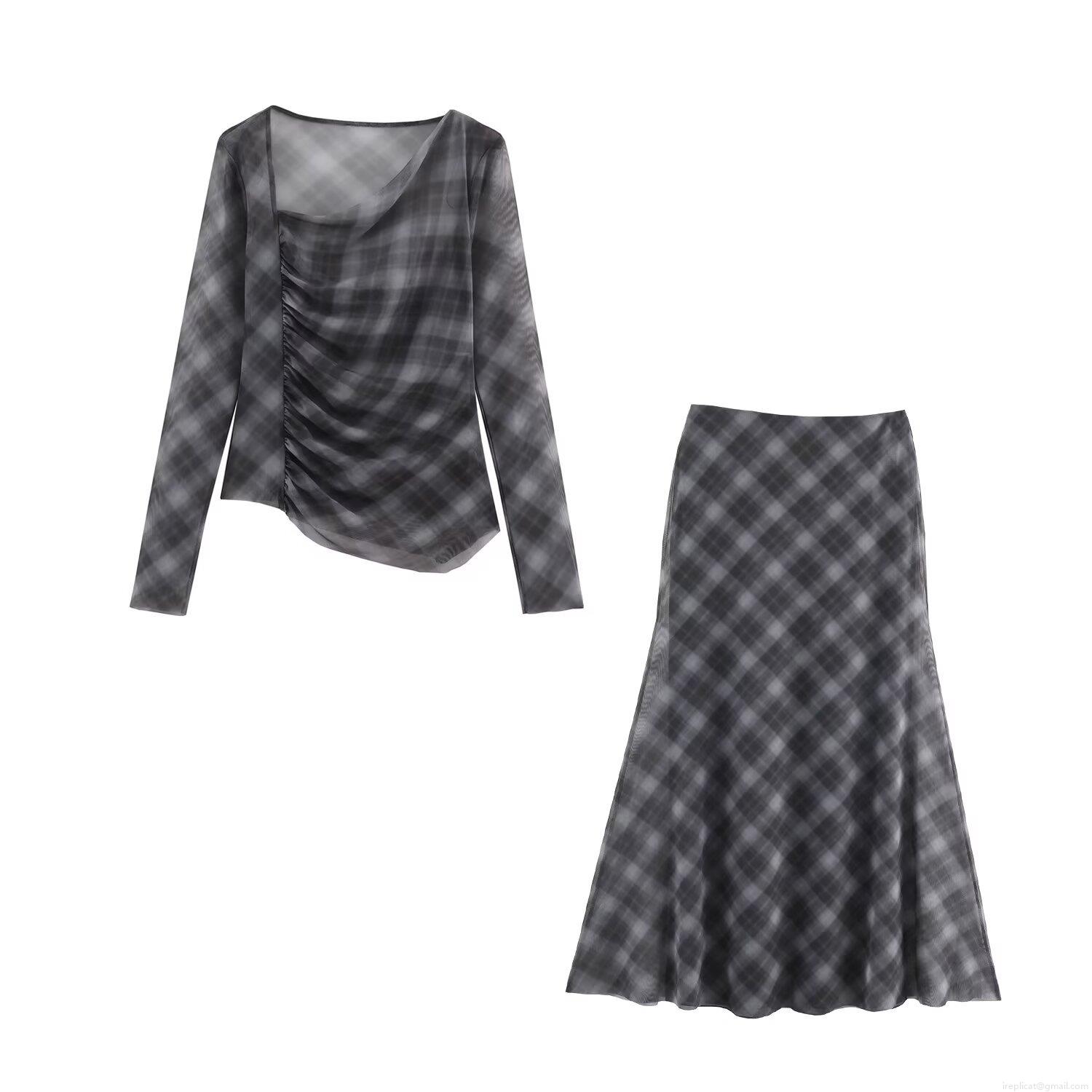 • Women Fashion Plaid Mesh Two Piece Set Asymmetric Long Sleeve Top And High Waist Midi A-Line Skirt Elegant Grey Checked Mesh Outfit For Women