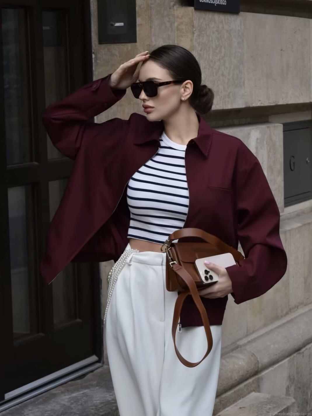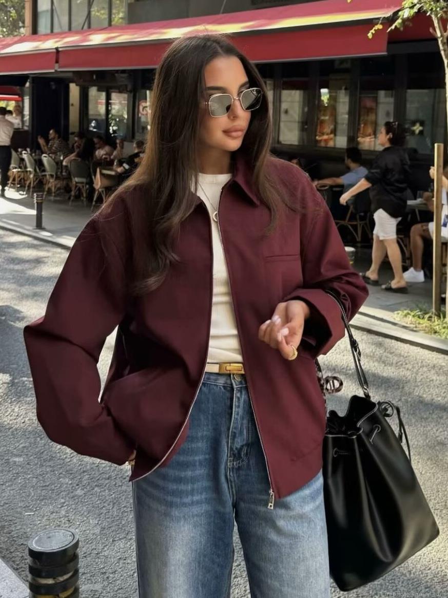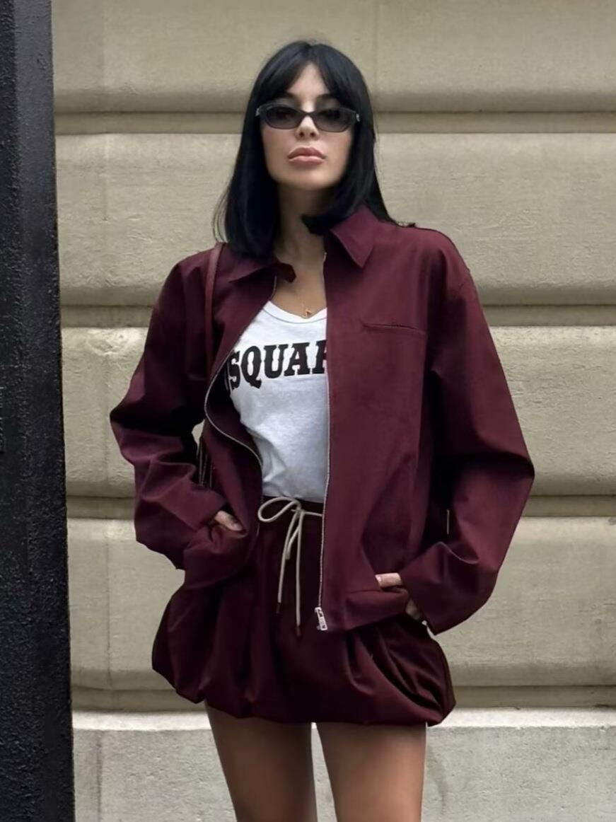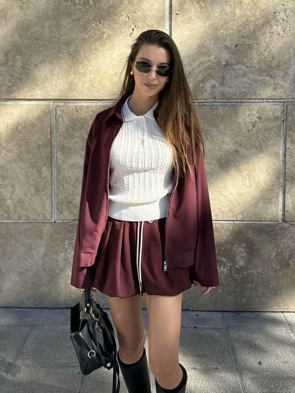• Women Fashion Wine Red Woven Set Long Sleeve Zipper Lapel Jacket Coat And Drawstring Mini Skirt Solid Color Casual Streetwear Two Piece Outfits
