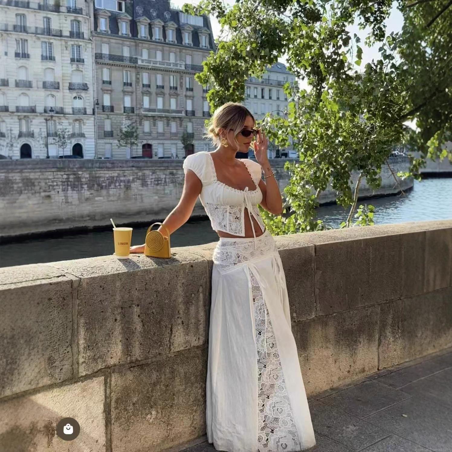 • Women French Romantic Lace Patchwork Two Piece Set Summer Vacation White Puff Sleeve Crop Top and High Waist Maxi Skirt Elegant Outfits