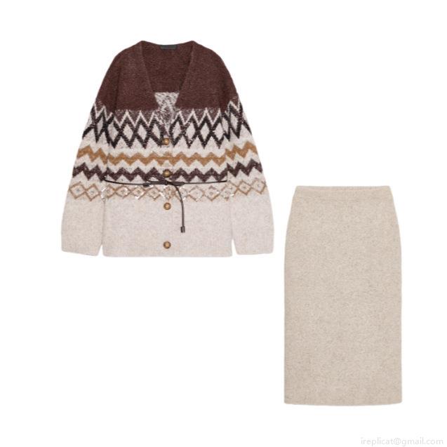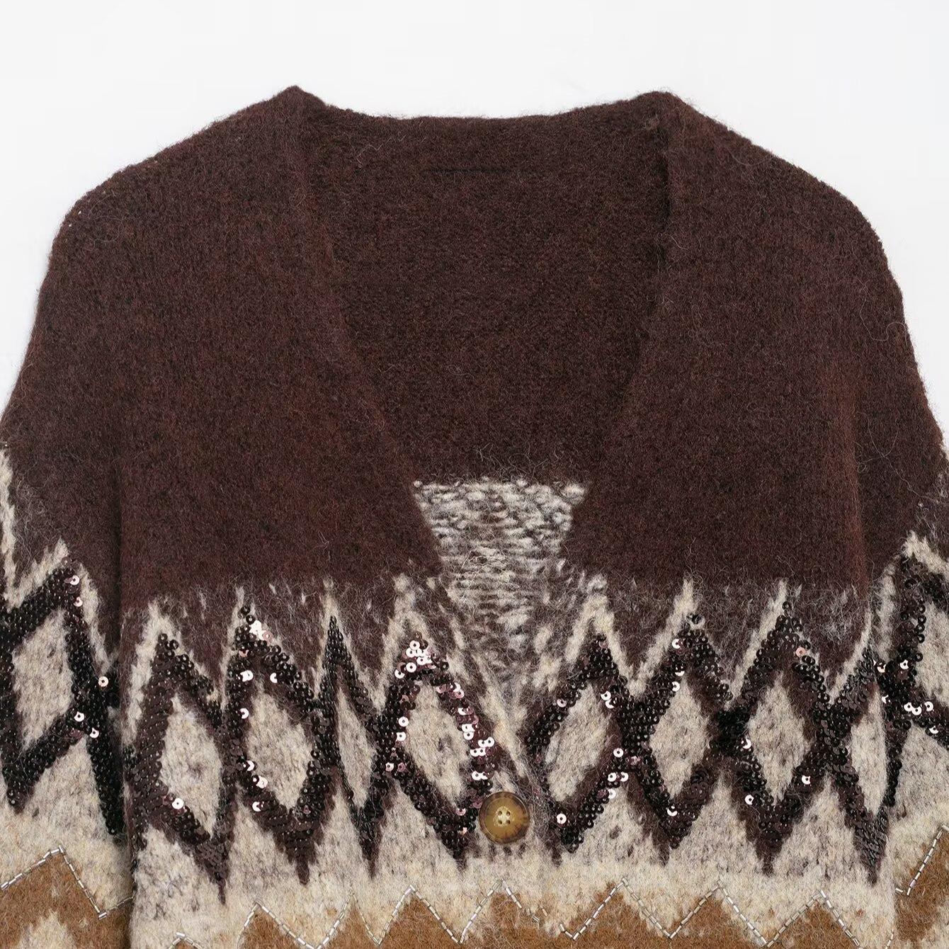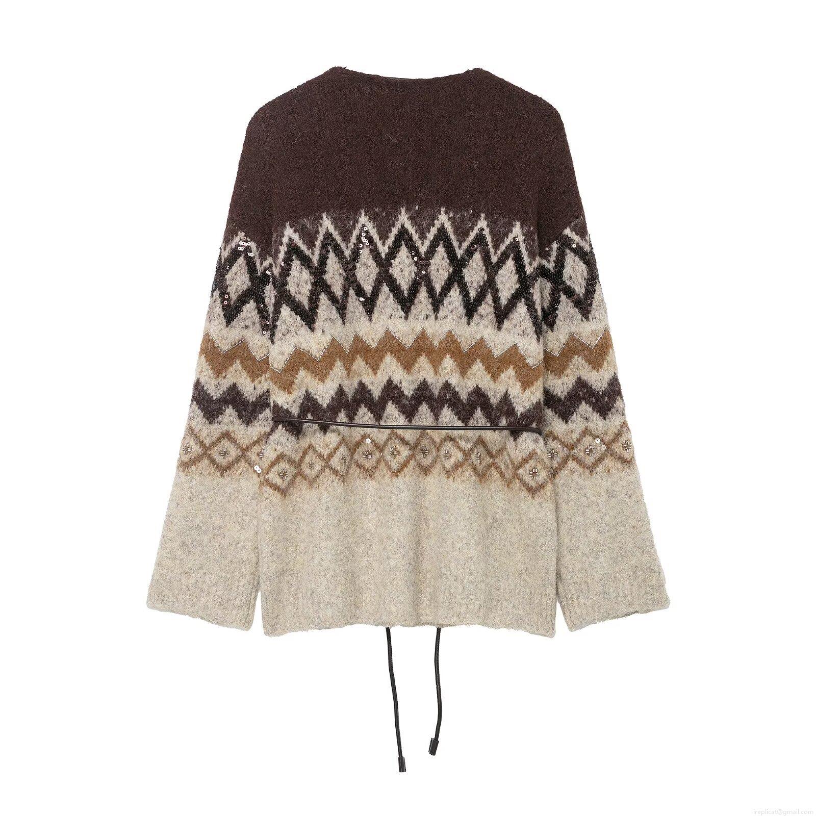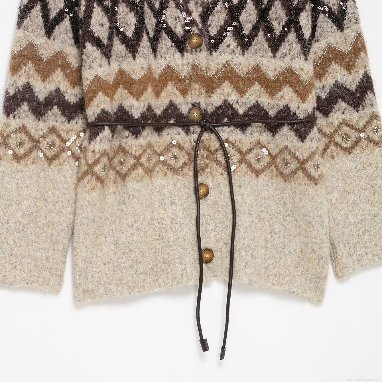 • Women Retro Bohemian Geometric Jacquard Knit Cardigan And Midi Skirt Set With Belt Sequin Detail Polyester Spandex Knitwear For Women