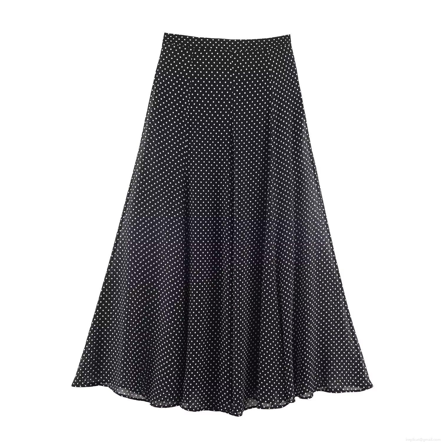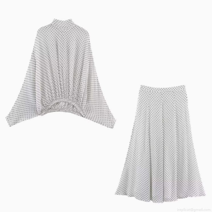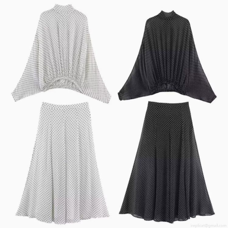 • Women Retro Polka Dot Two Piece Set Chiffon Bow Tie Neck Batwing Sleeve Blouse and High Waist A-Line Long Skirt Casual Streetwear Outfits