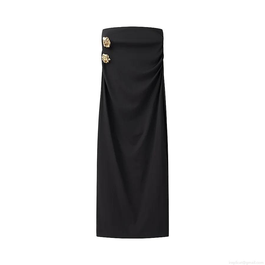 • Women Sexy 2 Piece Skirt Set Sleeveless Cutout Crop Top And High Waist Maxi Skirt With Gold Stereoscopic Rose Decoration Polyester Party Streetwear Outfits