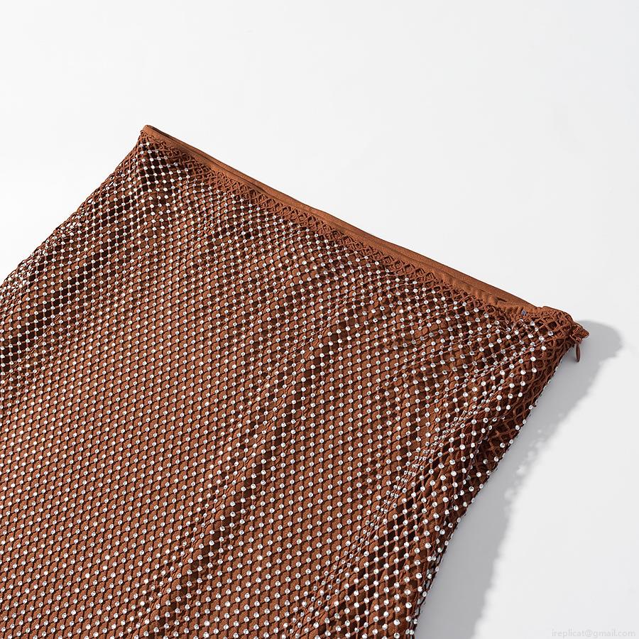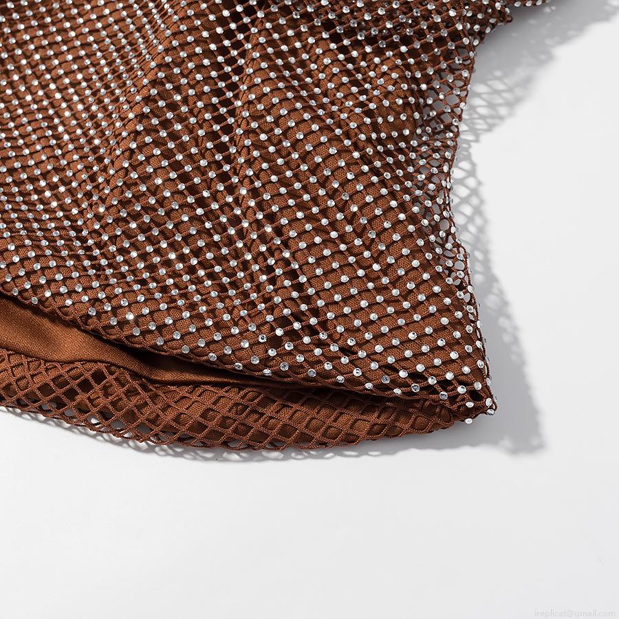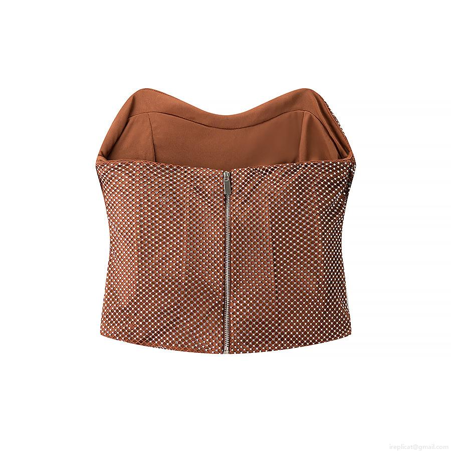 • Women Sexy Brown Mesh Rhinestone Two Piece Set Strapless Tube Top And Mini Skirt Sparkly Clubwear Party Outfits
